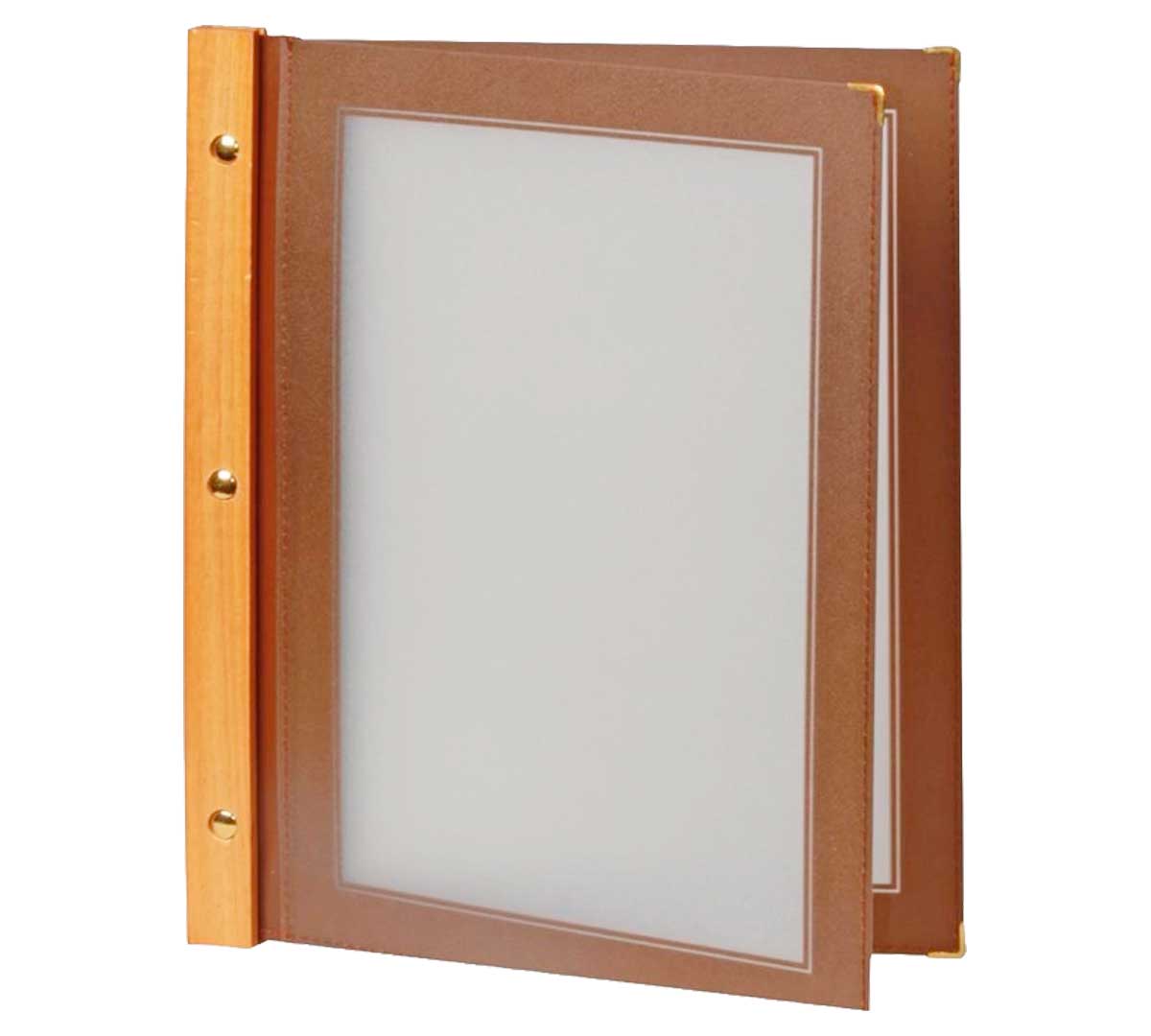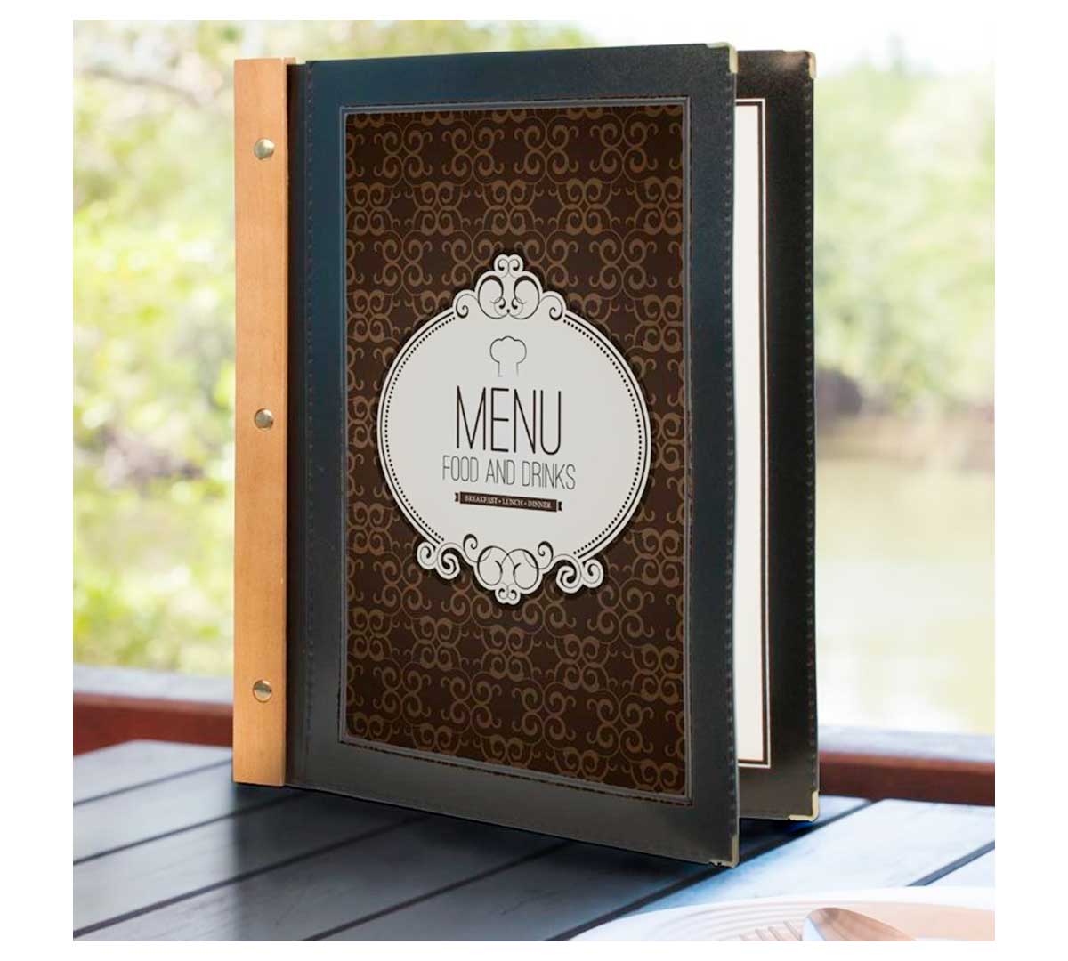 Fundas insertables diseñadas para proteger y renovar el interior de carpetas de menú con lomo de madera, facilitando la actualización de cartas de forma rápida y sencilla.