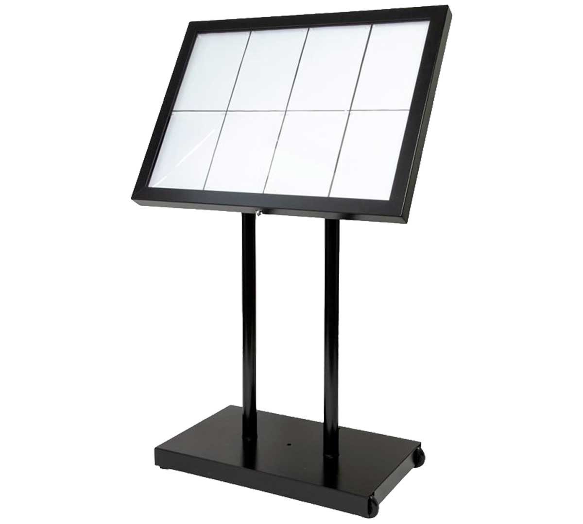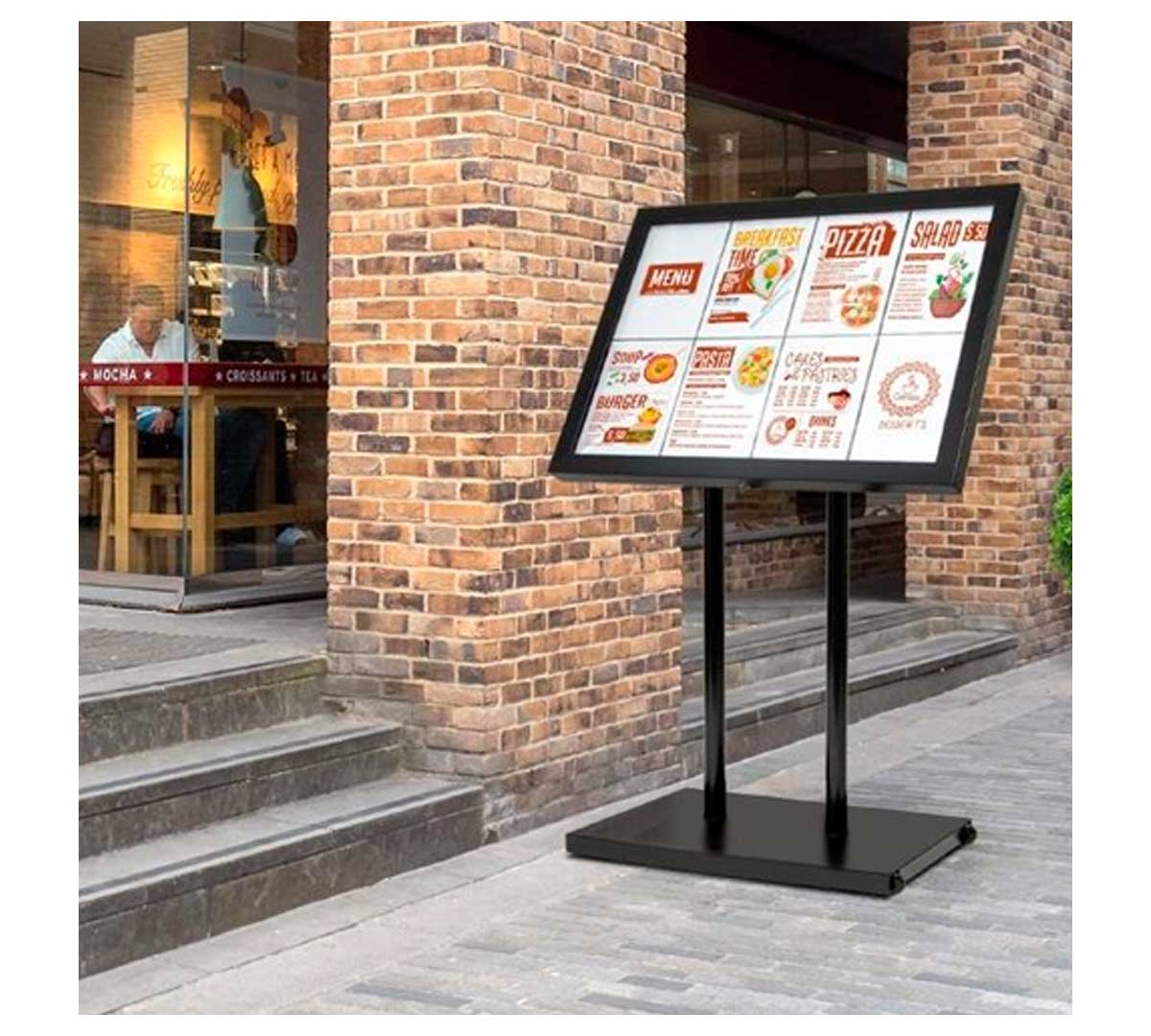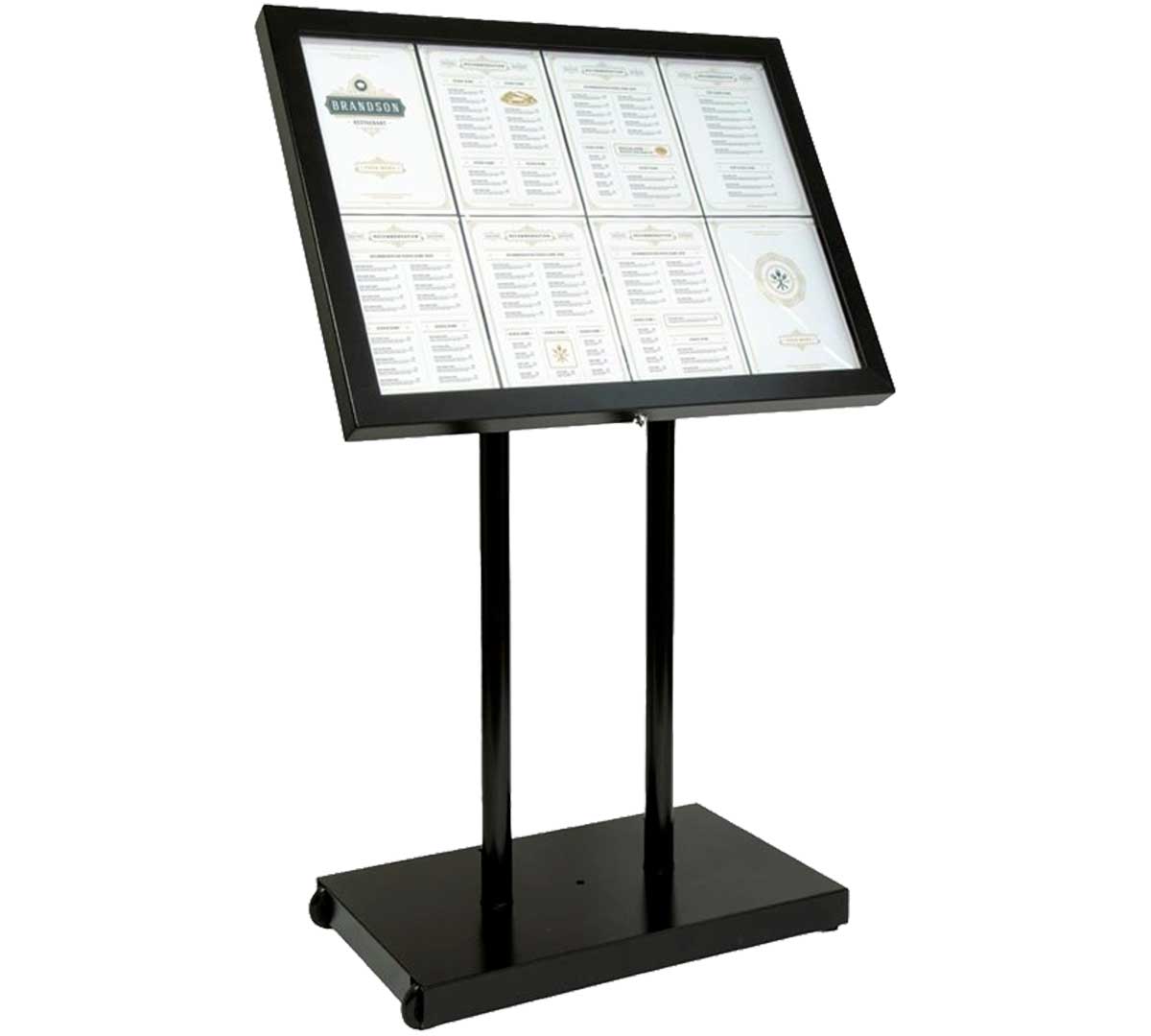 Este portamenús iluminado está especialmente indicado para mostrar cartas, menús o listas de vinos en zonas de baja iluminación, como terrazas, salones o entradas de restaurantes y bares, asegurando que la información sea siempre visible para los clientes.