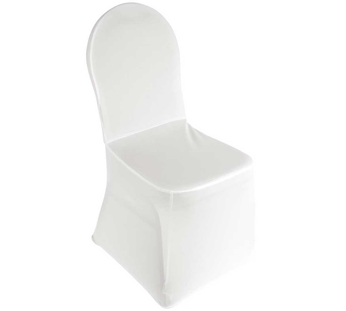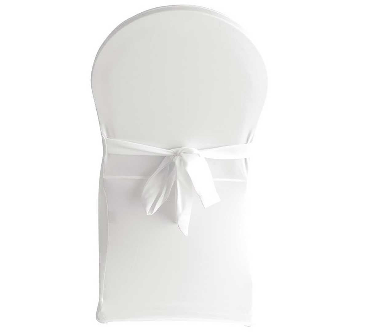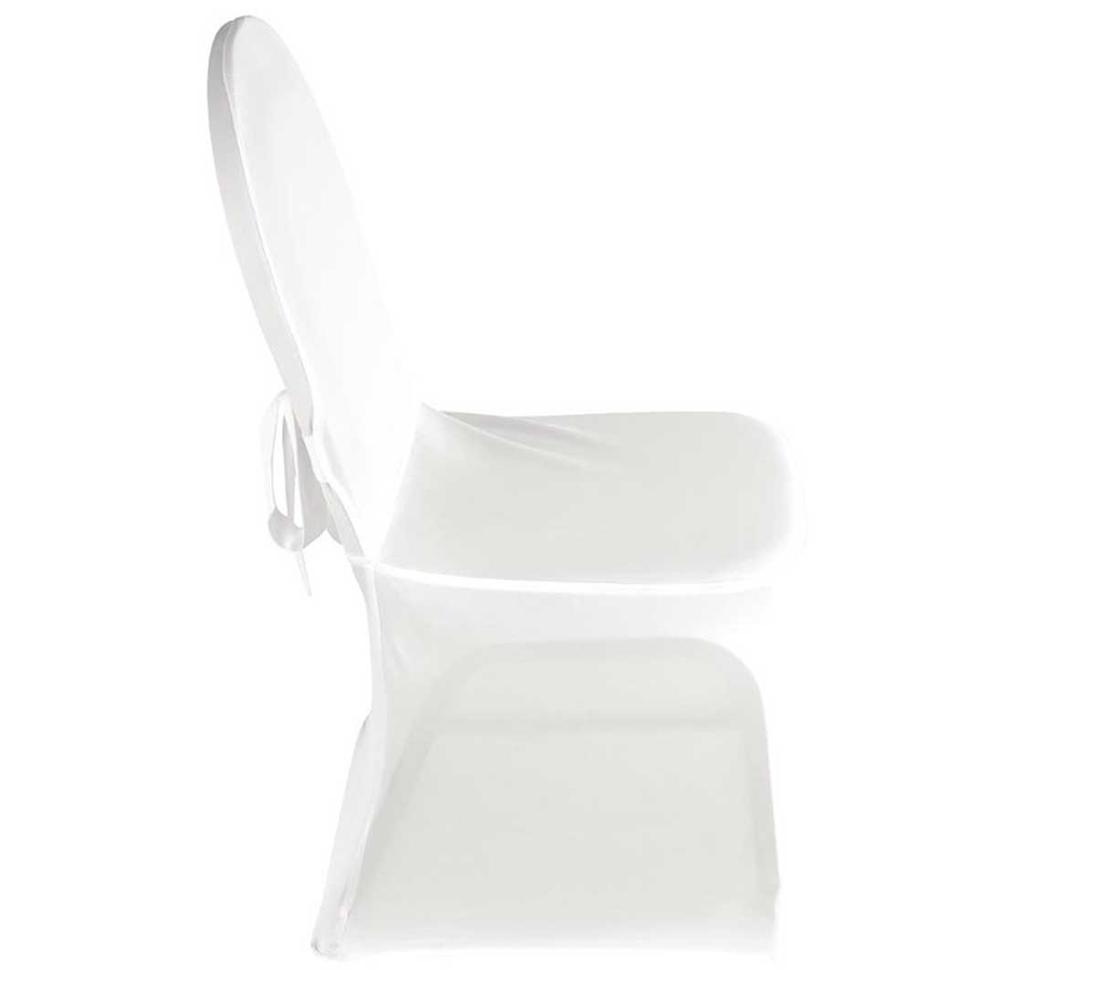 Funda de color blanca que aporta un toque elegante a las sillas. Ideal para bodas y recepciones. Está fabricada en tejido de punto elástico 100% poliéster.