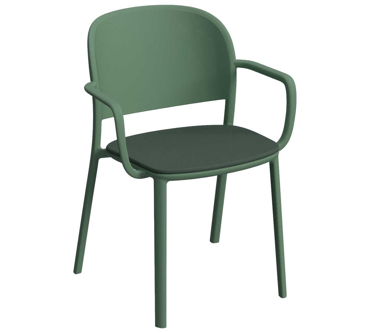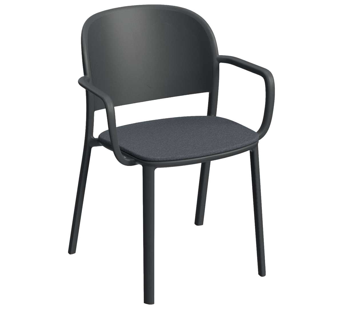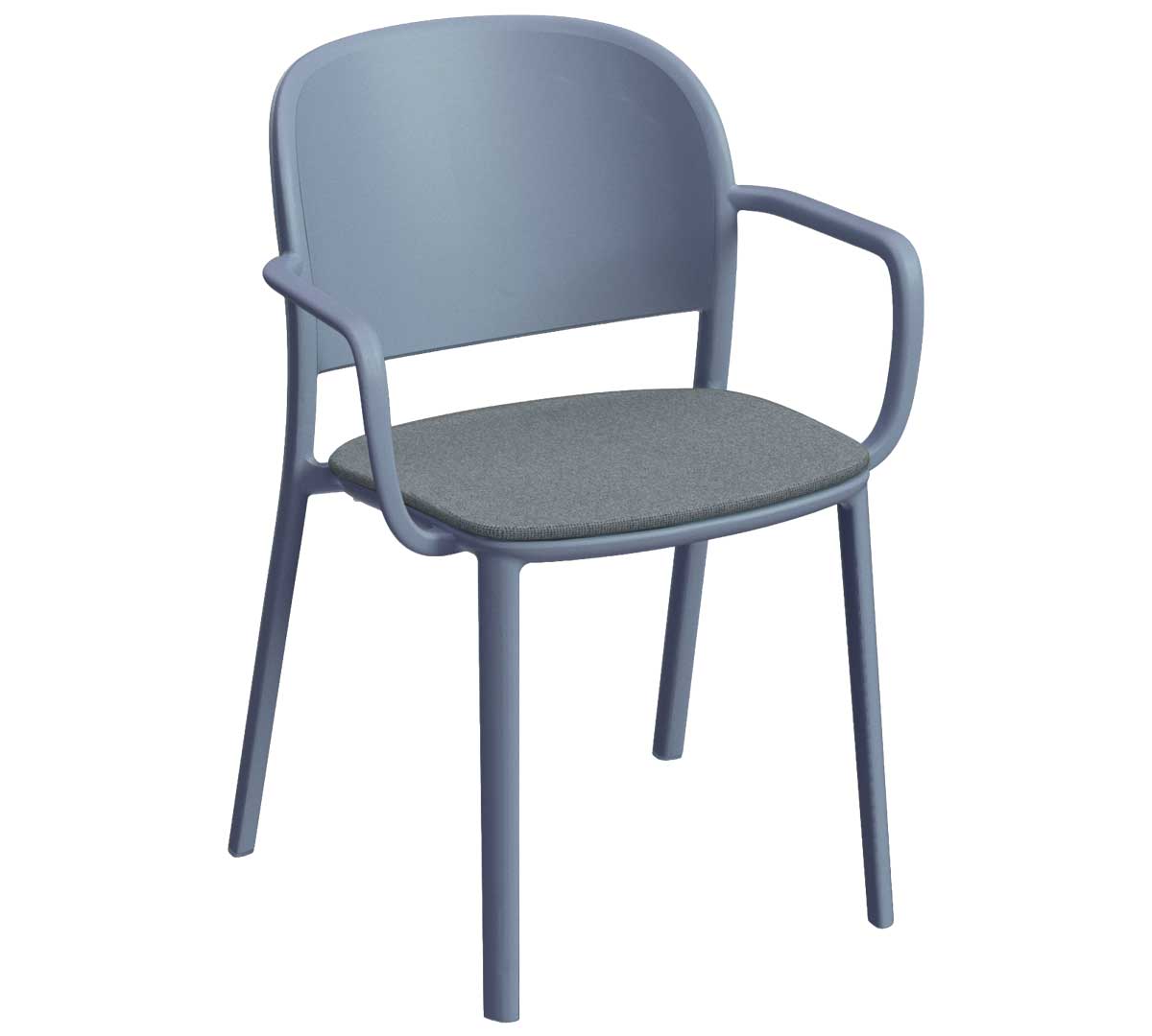 Silla con brazos para interior. Está fabricada en polipropileno reforzado con fibra de vidrio mediante inyección por gas, lo que le aporta resistencia y durabilidad. Incorpora tacos antideslizantes. Con asiento acolchado de poliéster 100% reciclado. No es apilable.