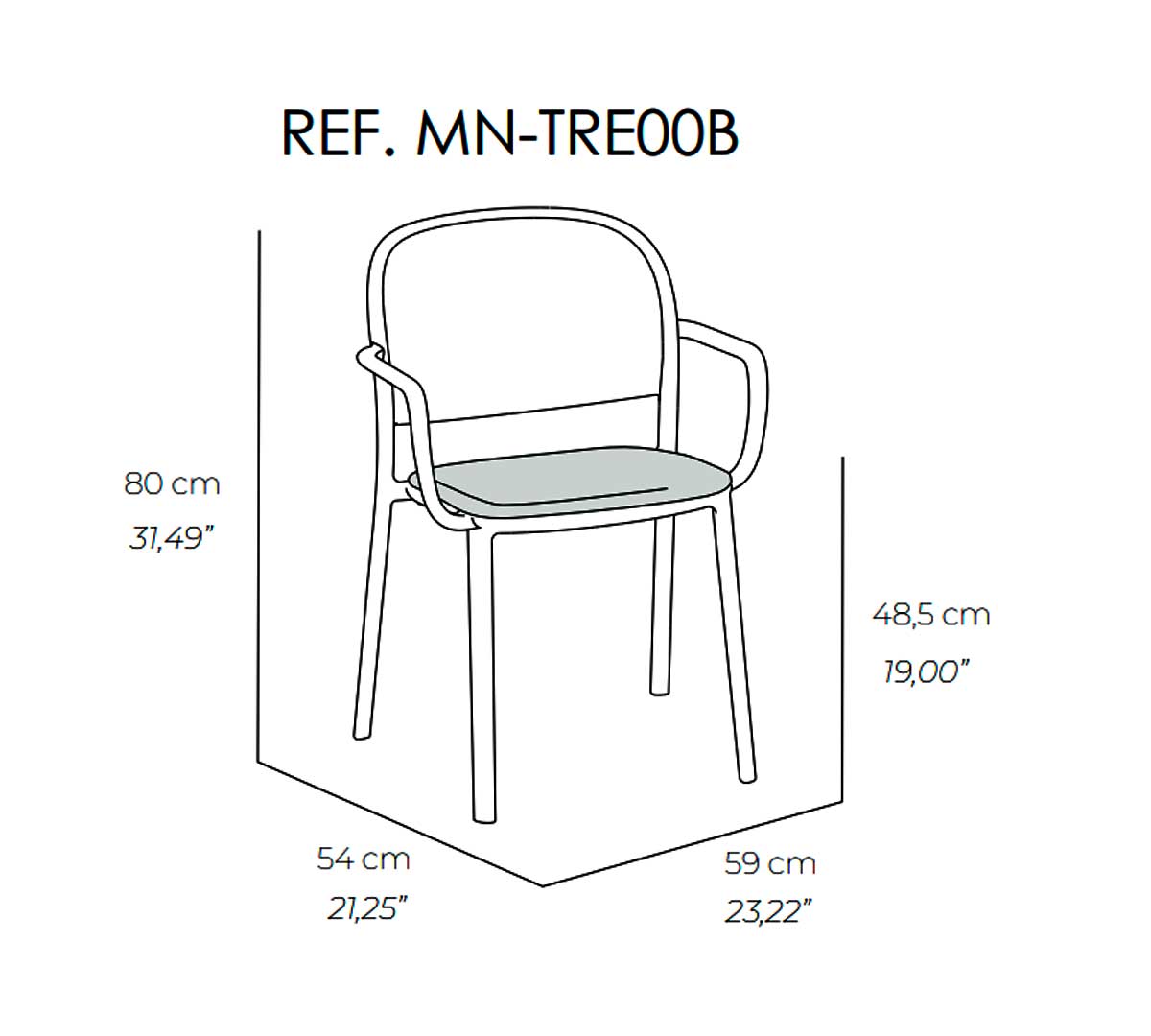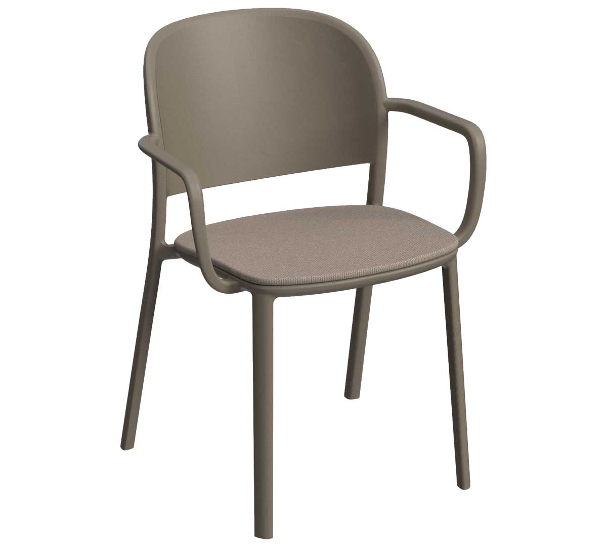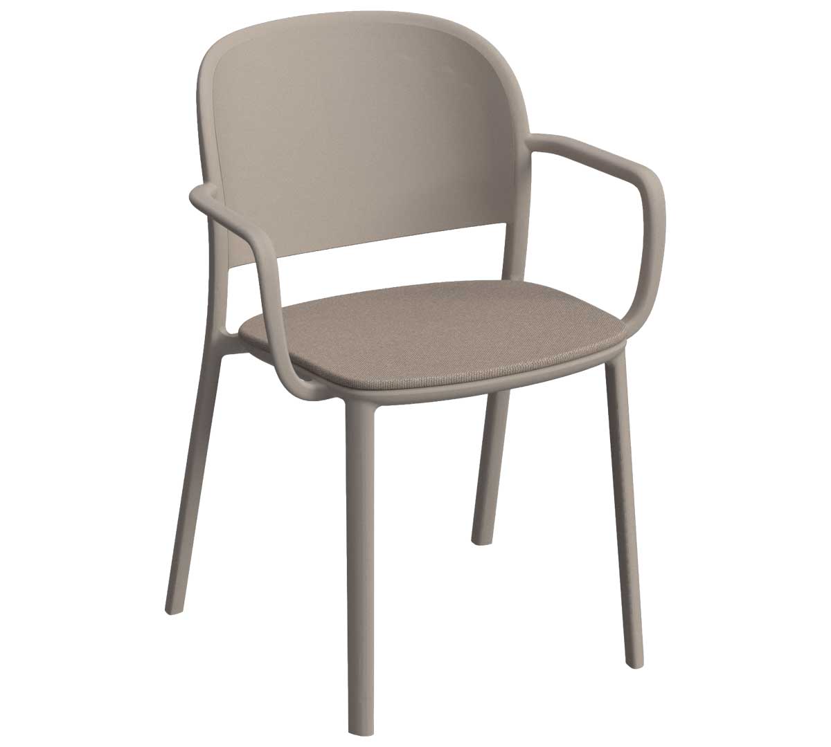 Silla con brazos para interior. Está fabricada en polipropileno reforzado con fibra de vidrio mediante inyección por gas, lo que le aporta resistencia y durabilidad. Incorpora tacos antideslizantes. Con asiento acolchado de poliéster 100% reciclado. No es apilable.