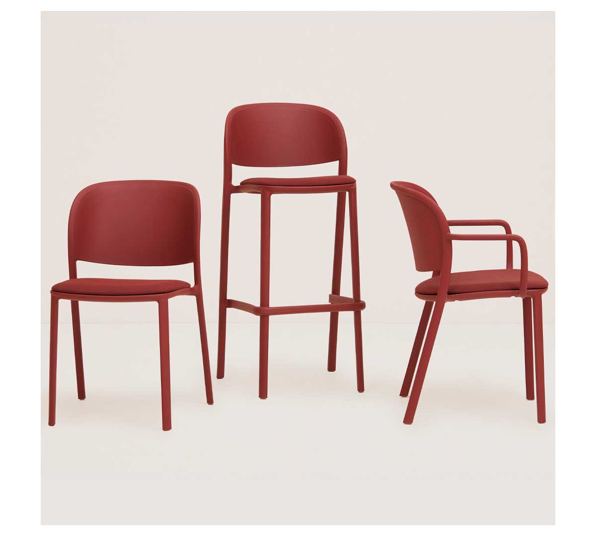 Su combinación de estructura plástica reforzada y cojín acolchado la hace especialmente adecuada para proyectos contract que priorizan la facilidad de limpieza, la durabilidad del tapizado y una estética cálida.