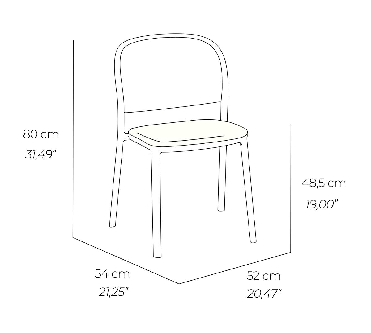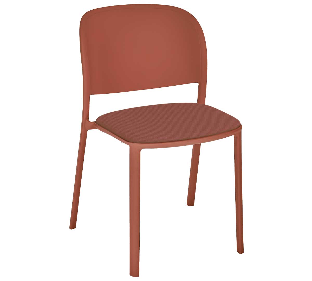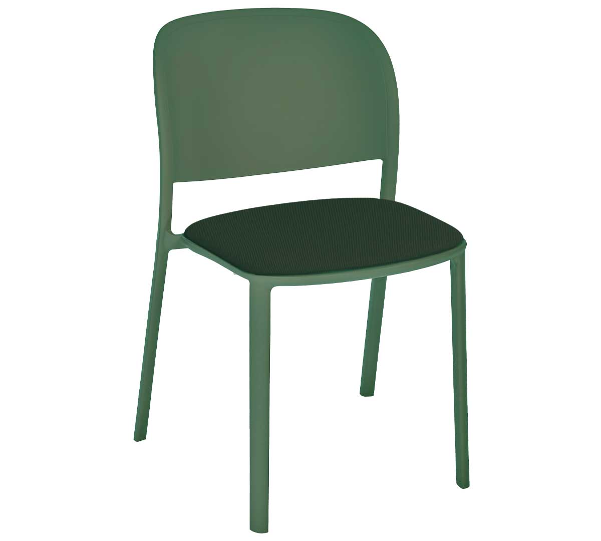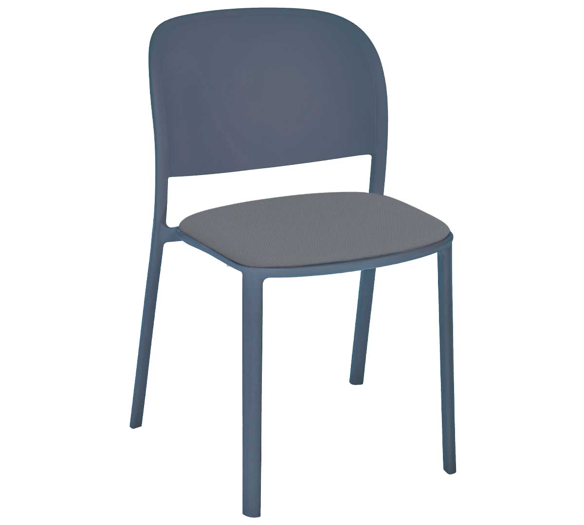 Silla sin brazos para interior. Está fabricada en polipropileno reforzado con fibra de vidrio mediante inyección por gas, lo que le aporta resistencia y durabilidad. Incorpora tacos antideslizantes. Con asiento acolchado de poliéster 100 % reciclado. No es apilable.