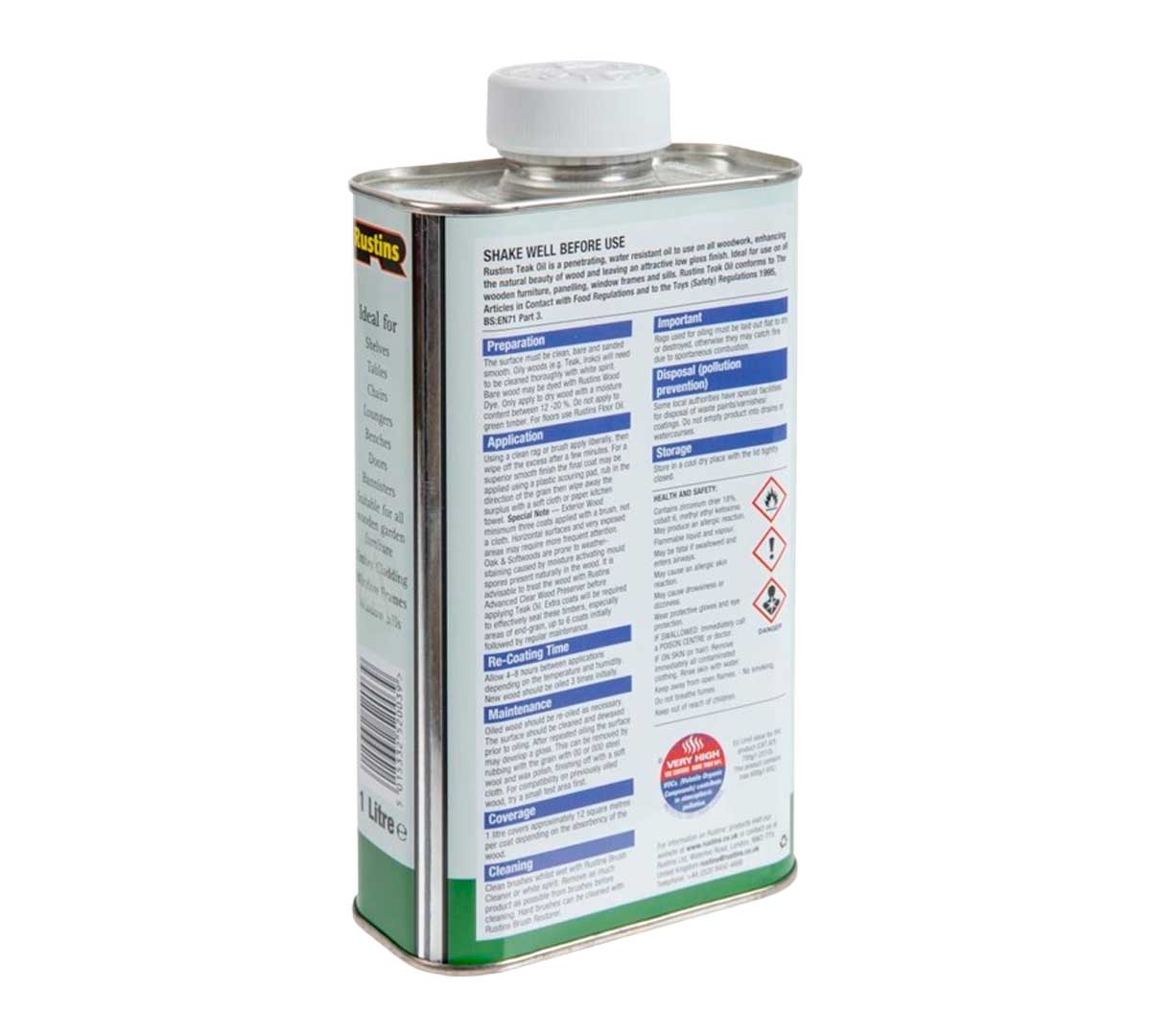 El Aceite de Teca Rustins 1 litro es un tratamiento para madera de secado rápido, formulado con una mezcla especial de aceites vegetales y resinas, indicado para devolver el brillo natural y proteger superficies de madera sin tratar.