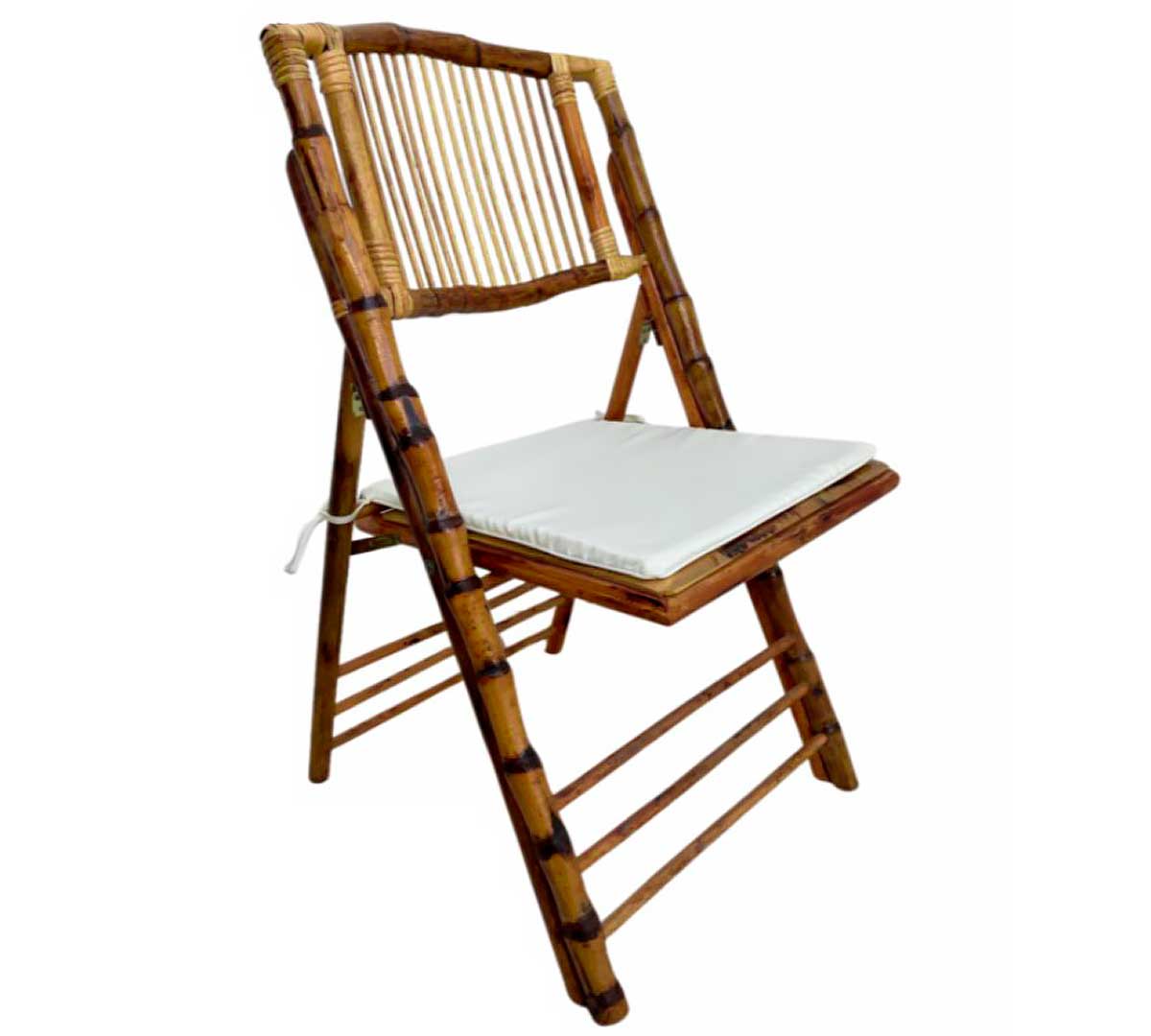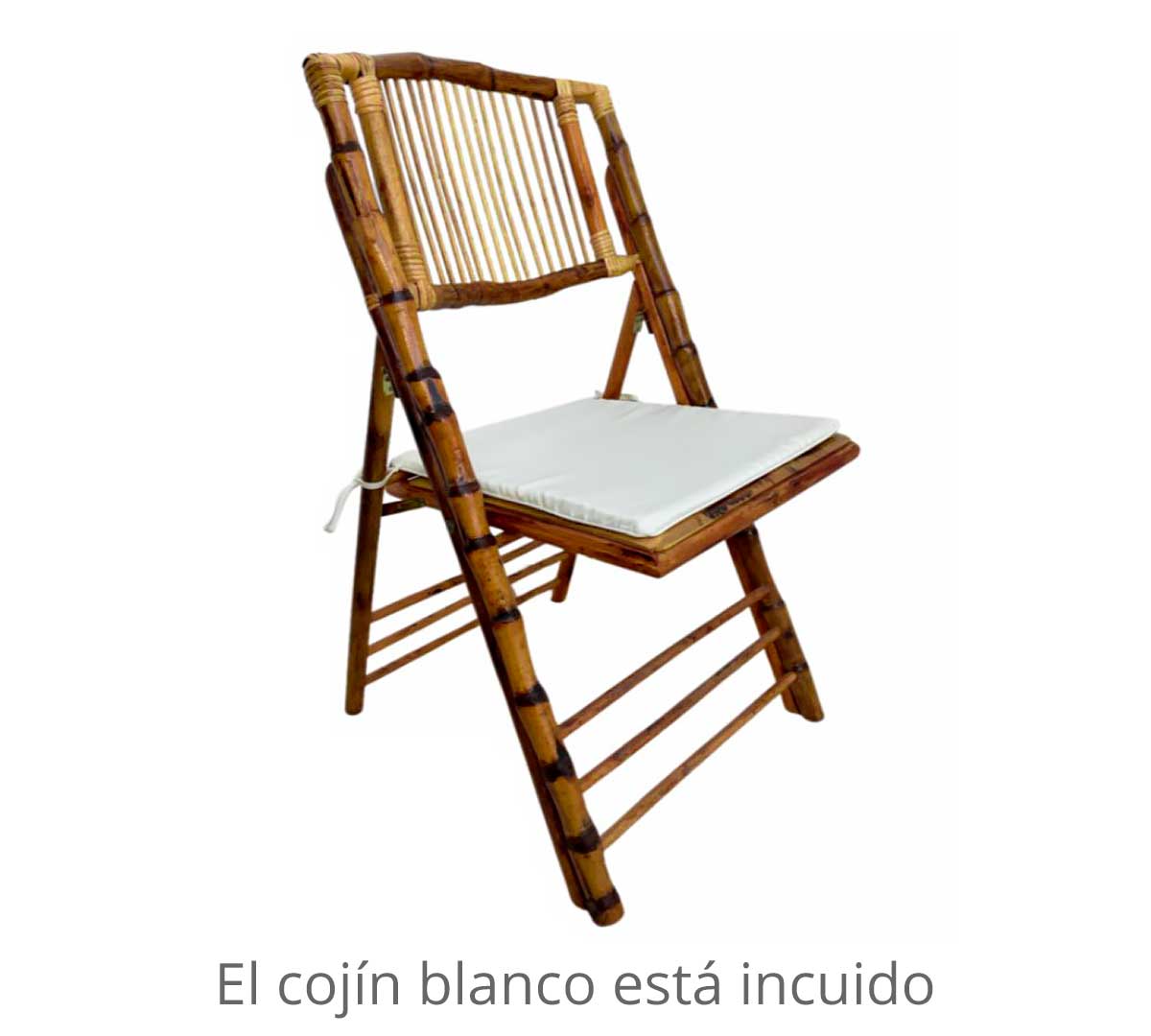 Silla fabricada en madera de bambú ideal para eventos y celebraciones. Es plegable, por lo que permite un fácil almacenamiento y transporte. Incluye un cojín en color blanco que añade comodidad.