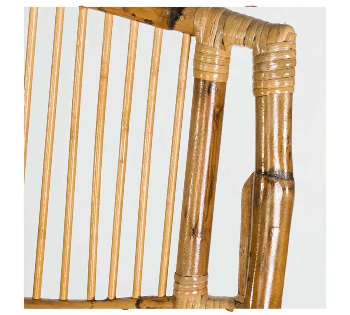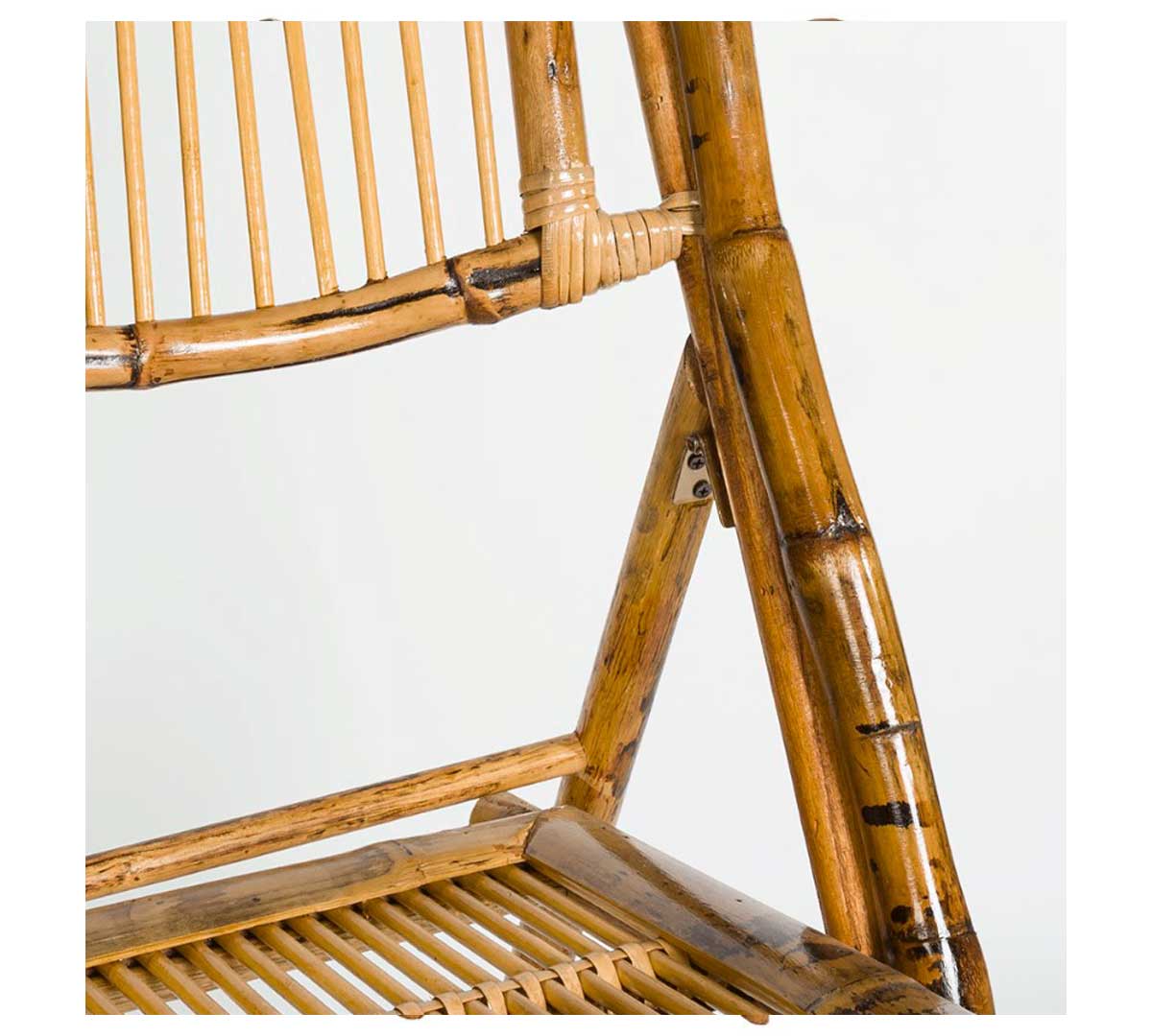 Esta silla está fabricada en madera de bambú natural barnizado. El barniz protege la madera de las inclemencias del tiempo, pero requerirá cierto mantenimiento a largo plazo.
