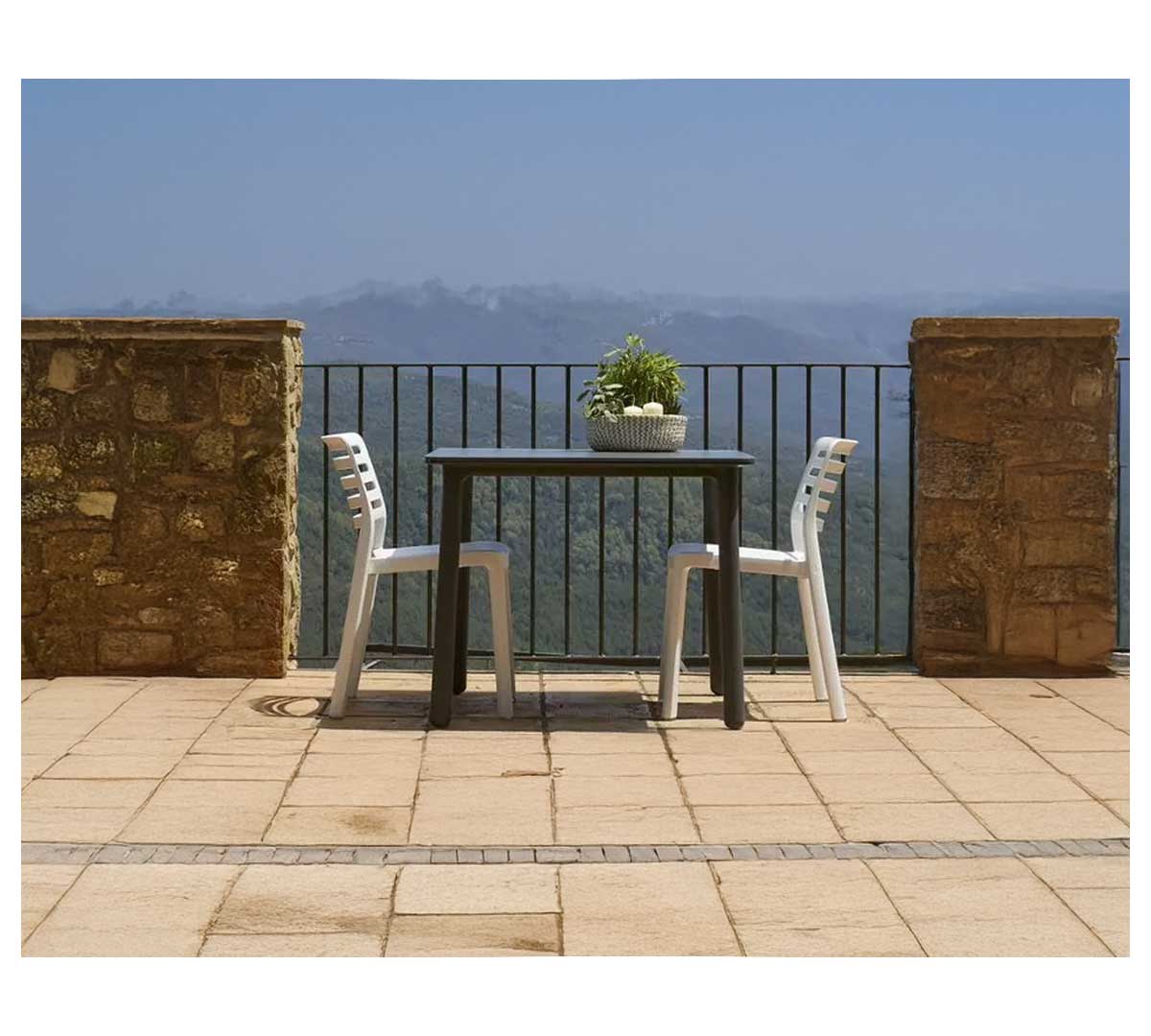 Silla apilable apta para exteriores. Está fabricada con polipropileno inyectado. Cuenta con protección UV. Sus dimensiones son 58,8 cm de ancho, 54,6 cm de fondo y 78,4 cm de alto.