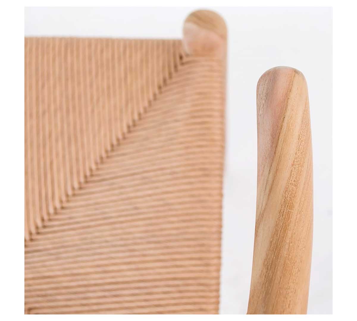 Sillón fabricado de forma artesanal en madera natural de teca. El asiento es de tejido sintético en color natural. Es cálido y elegante, tiene una forma ergonómica que proporciona comodidad.