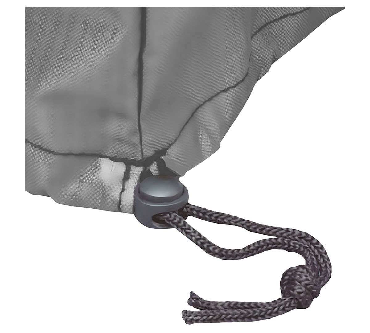 Funda protectora en color gris claro diseñada para proteger muebles exteriores en terrazas, jardines y espacios de hostelería. Fabricada en poliéster reciclable Ripstop, ofrece impermeabilidad y ajuste seguro.