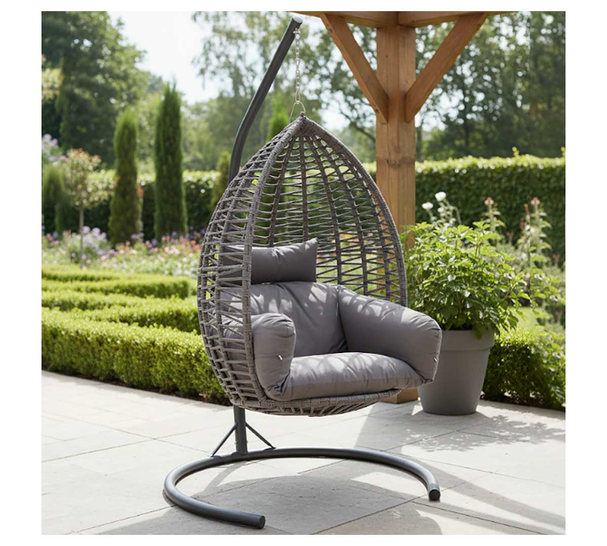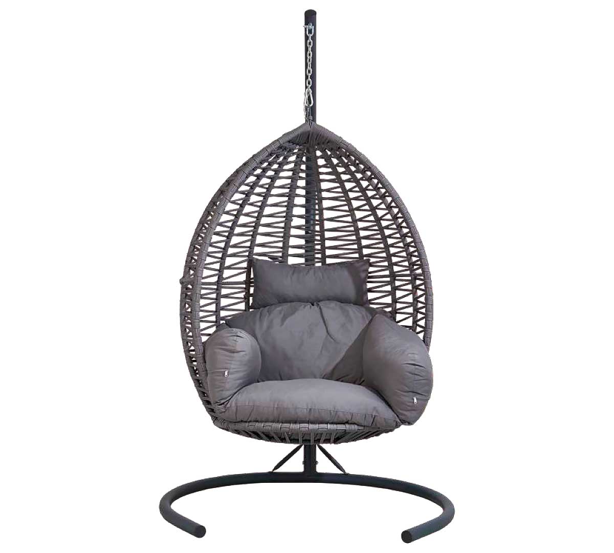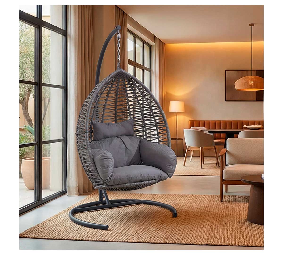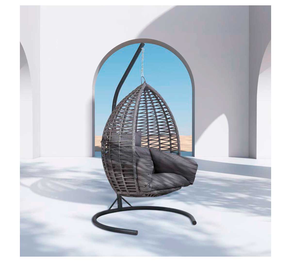 Balancín colgante de exterior con estructura metálica de alta resistencia y carcasa trenzada en cuerda sintética. Diseñado para ofrecer una zona de relax envolvente con gran estabilidad y confort gracias a sus cojines acolchados y su formato de cápsula suspendida.