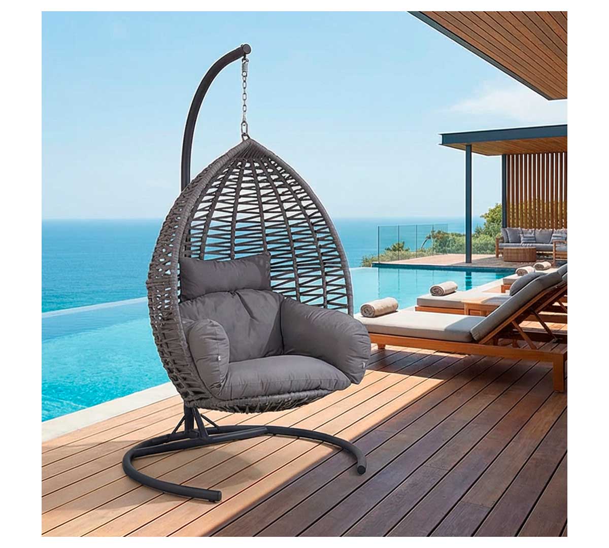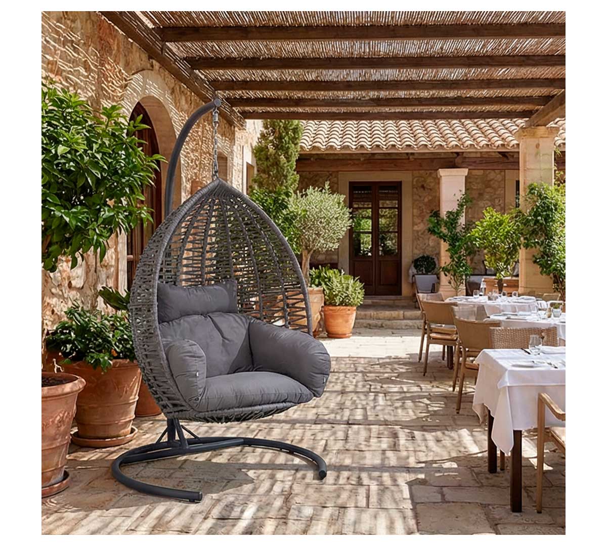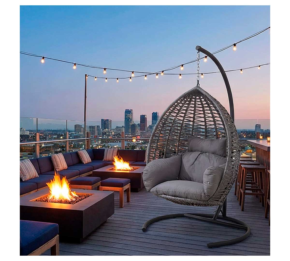 Una de sus grandes ventajas es que combina imagen premium y confort en una sola pieza. Su formato de cápsula suspendida ayuda a crear rincones más atractivos y fotogénicos, mientras que los cojines acolchados mejoran la experiencia de uso. Es una buena opción para negocios que quieren diferenciar su terraza o zona lounge.
