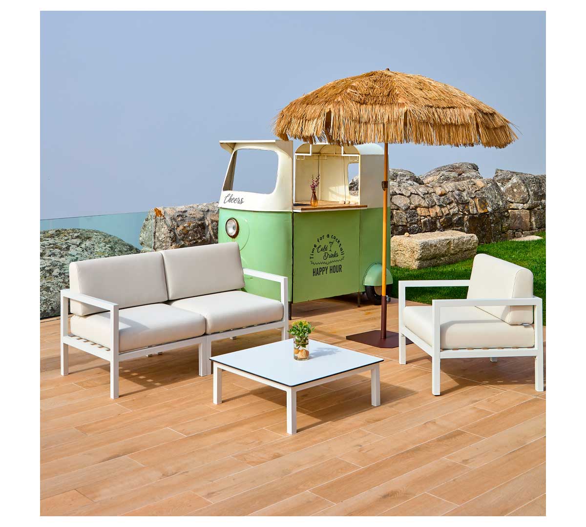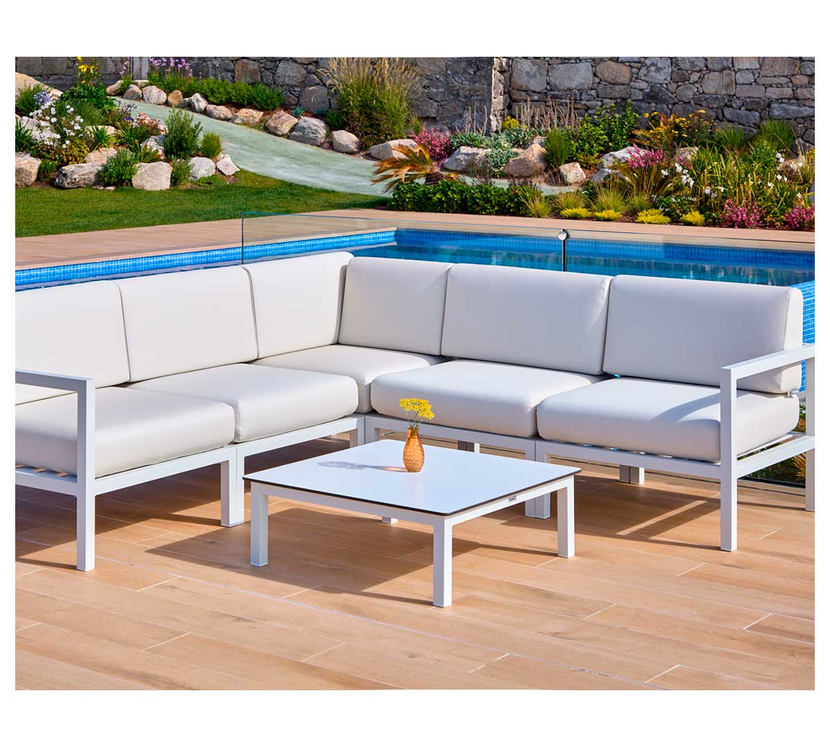 La Mesa Marine de Ezpeleta es un modelo apto para exteriores. Está fabricada en aluminio lacado y es el complemento ideal para los sofás Marine. En color blanco.