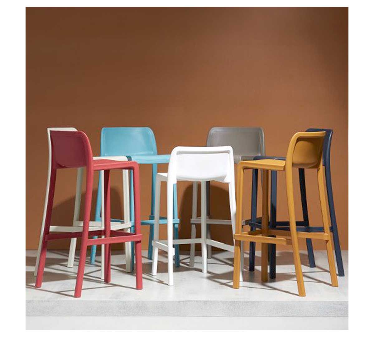 Taburete de polipropileno reforzado con fibra de vidrio. Equipado con tacos antideslizantes. Sus dimensiones son 51 x 50 x 95 cm. Está disponible en varios colores.