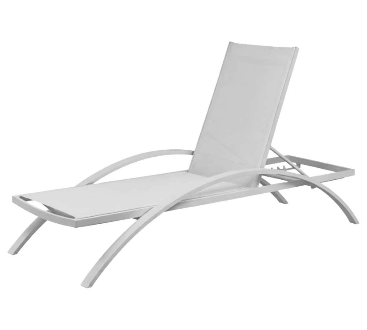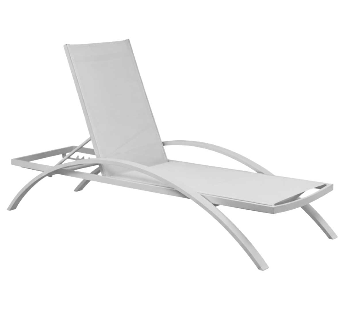 Tumbona de exterior con estructura de aluminio en color blanco con brazos plastificados. El resplado y asientos están confeccionados en tejido textilene en color blanco. Es apilable. Sus dimensiones son 190 x 73 x 34 cm. Ideal para terrazas de hotel, zonas de piscina, solárium, beach clubs, chiringuitos y áreas lounge en restaurantes.