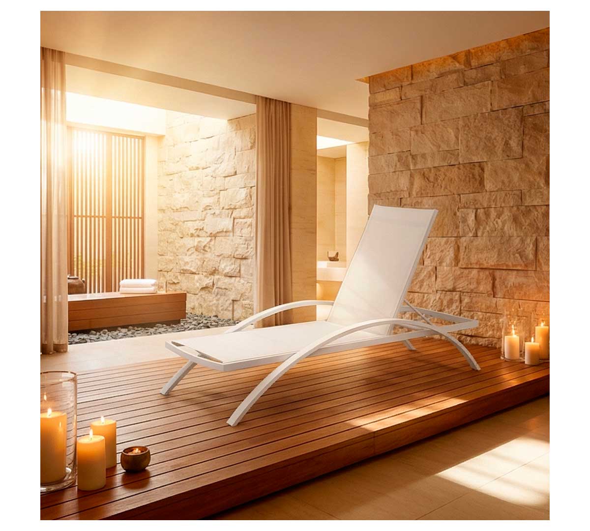 La Roco Tumbona 8000 está especialmente indicada para terrazas de hotel, zonas de piscina, solárium, beach clubs, chiringuitos y áreas lounge en restaurantes. También resulta adecuada para espacios exteriores en complejos turísticos, spas con zona al aire libre o terrazas chill out donde se priorice el confort del usuario y una estética cuidada con cierto aire rústico o industrial.