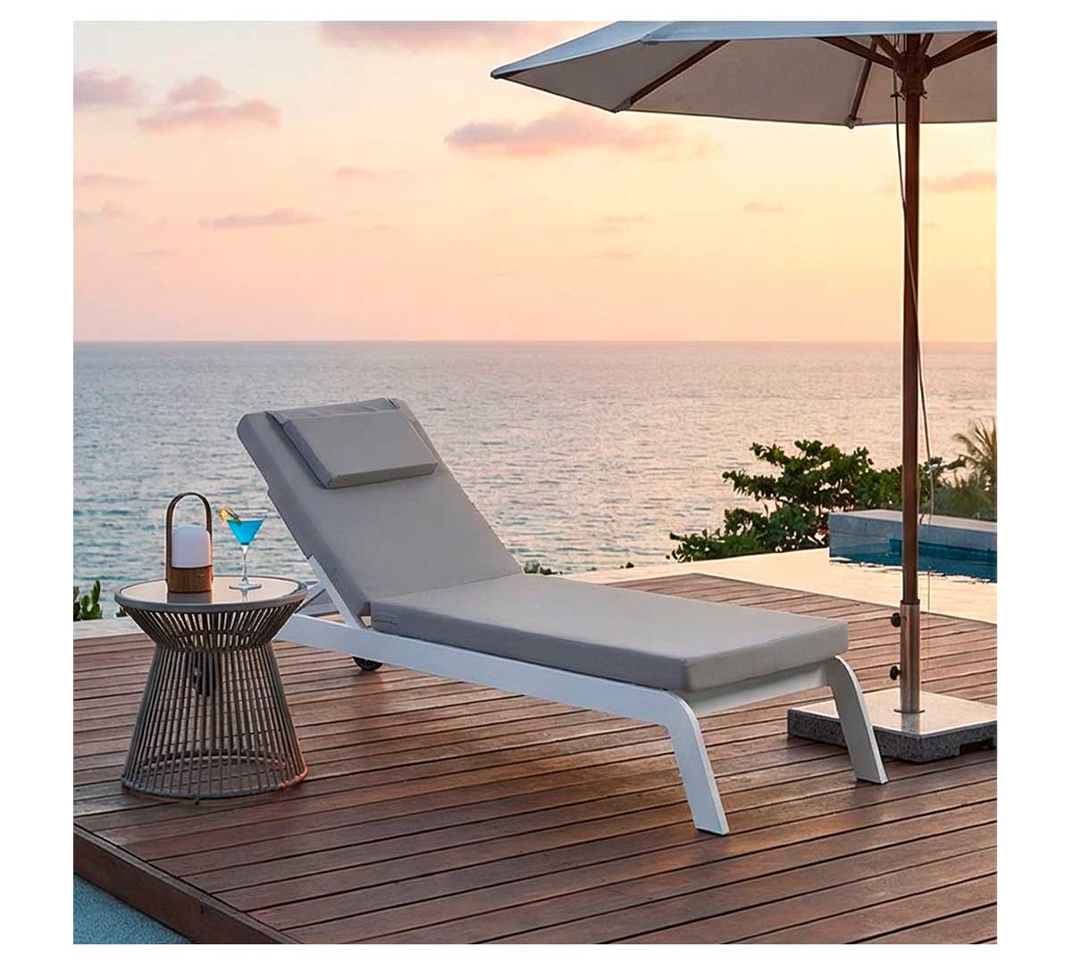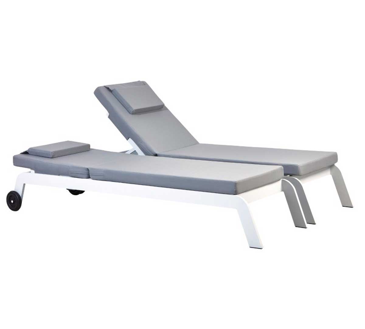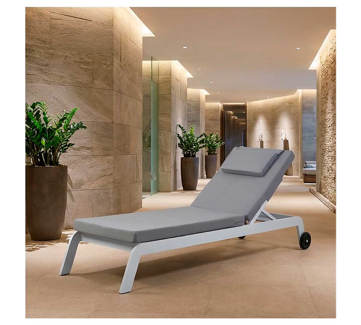 Tumbona de exterior con estructura de aluminio en color blanco. Incluye cojín continuo tapizado en tejido técnico específico para exterior. Es apilable. El respaldo reclinable en varias posiciones. Sus dimensiones son 200 x 55 x 39 cm. Con ruedas traseras para facilitar su desplazamiento.