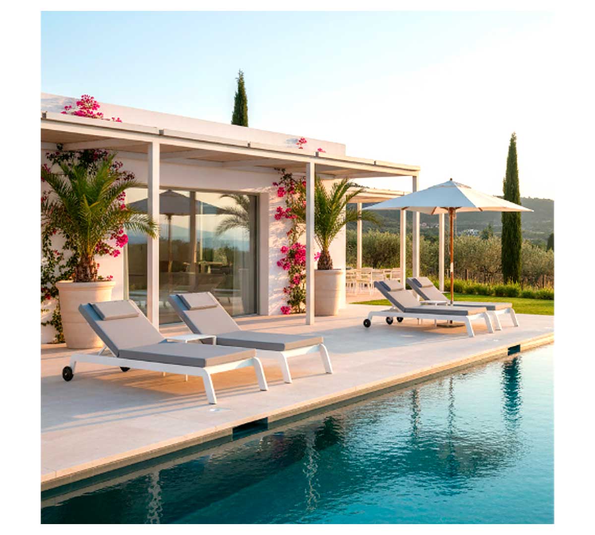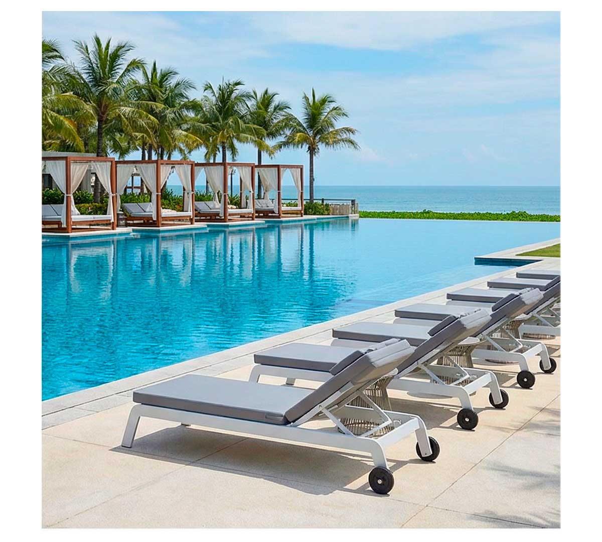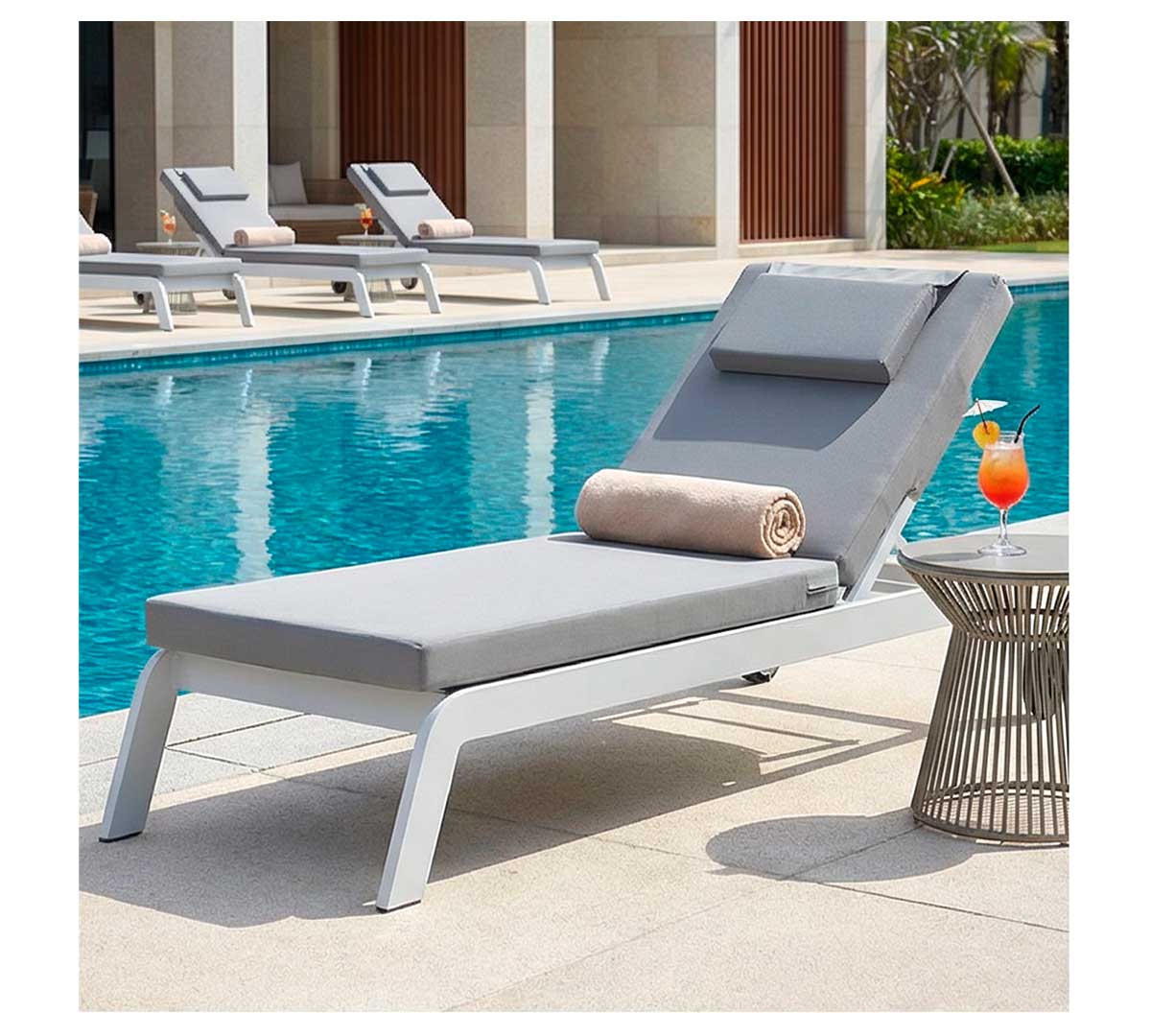 Esta tumbona de jardín está especialmente orientada a zonas de piscina, terrazas de hotel, resorts y espacios lounge en exterior donde se requiera una solución de descanso cómoda y estable. También encaja en áreas residenciales de alto nivel que busquen un mobiliario de exterior con estética cuidada y mantenimiento sencillo.