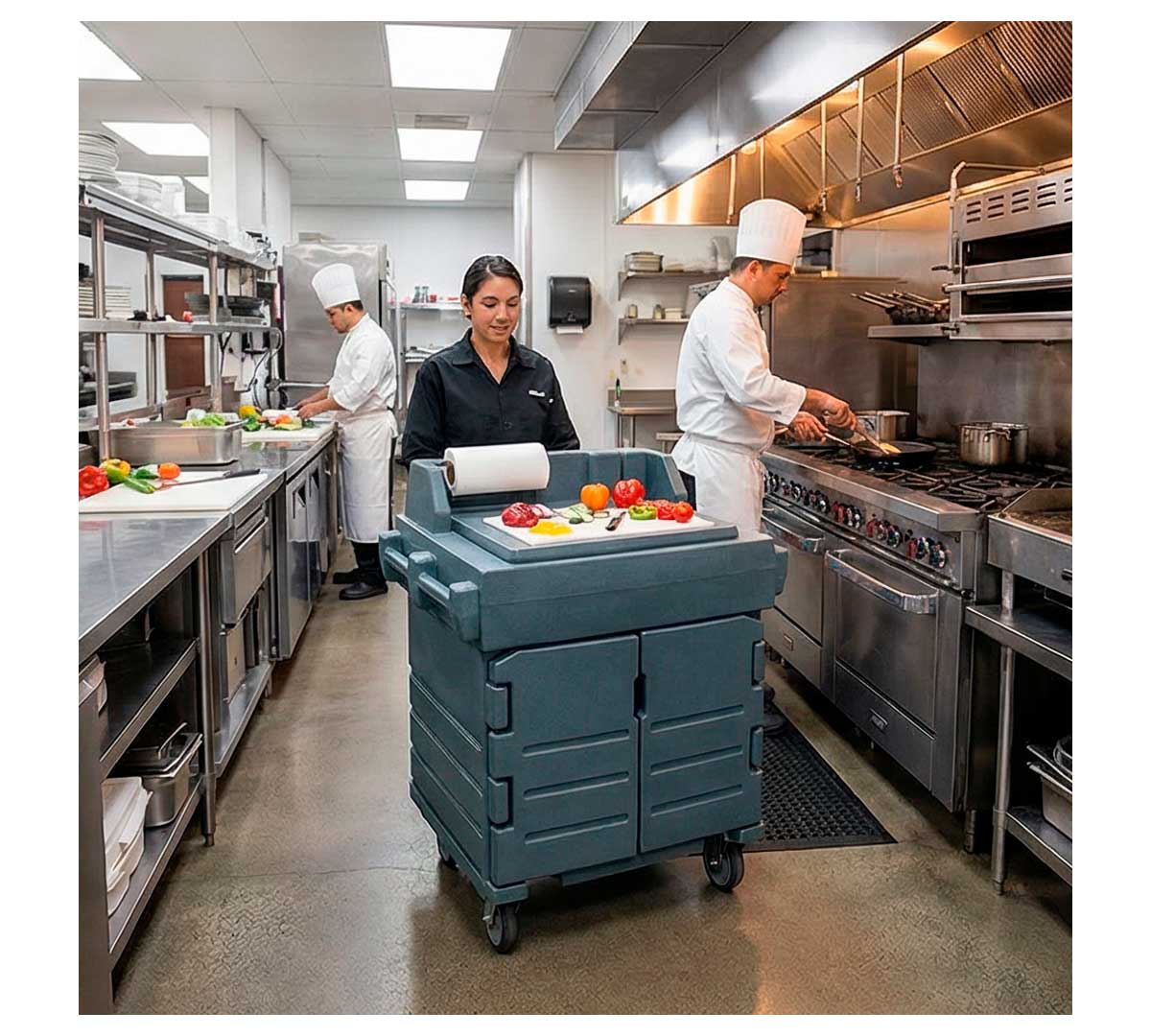 La Estación de Trabajo Cambro es una solución robusta y versátil, perfecta como estación móvil o mostrador auxiliar, diseñada para facilitar tanto la exposición de productos como la gestión de transacciones.