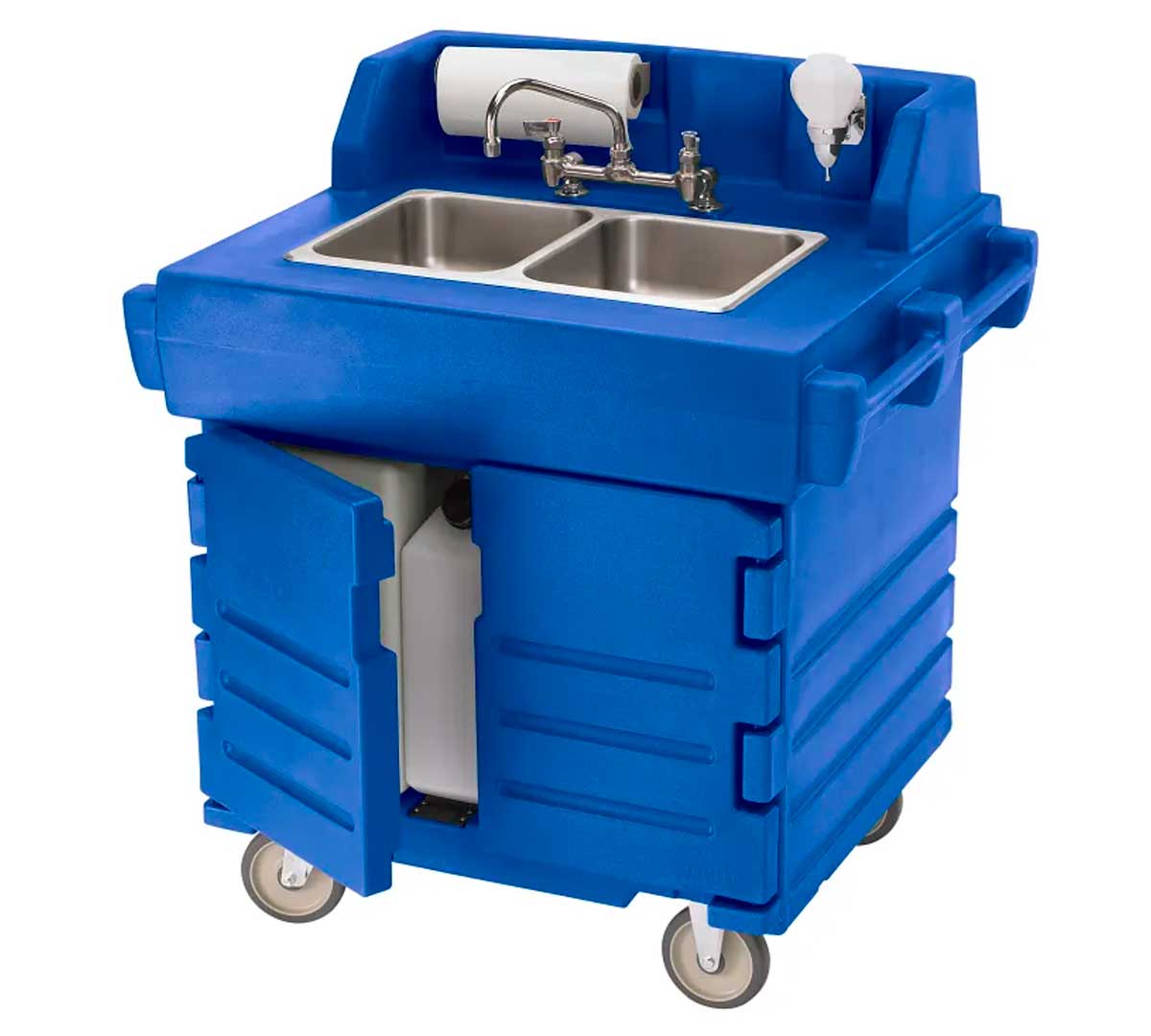Solución móvil para lavado de manos con fregaderos dobles, agua caliente o fría, depósitos independientes y estructura resistente de polietileno. Fácil de mover y limpiar.