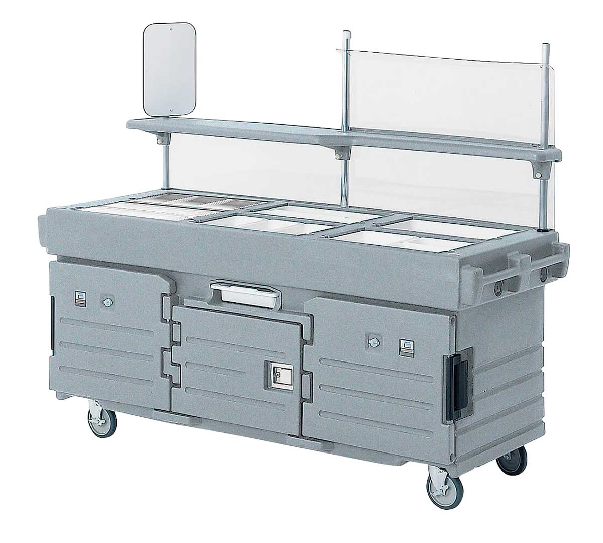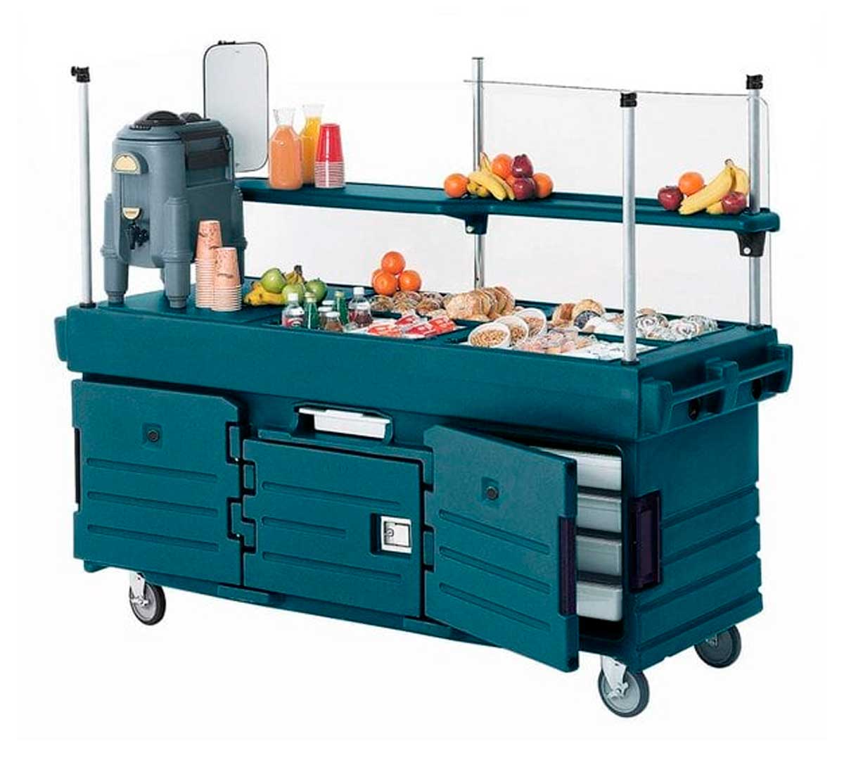 El Carro Camkiosk de Cambro es una solución versátil y robusta para el servicio de alimentos en movilidad. Su diseño está pensado para facilitar la distribución de platos fríos o calientes en cualquier entorno, garantizando la conservación óptima de la temperatura y una presentación profesional.