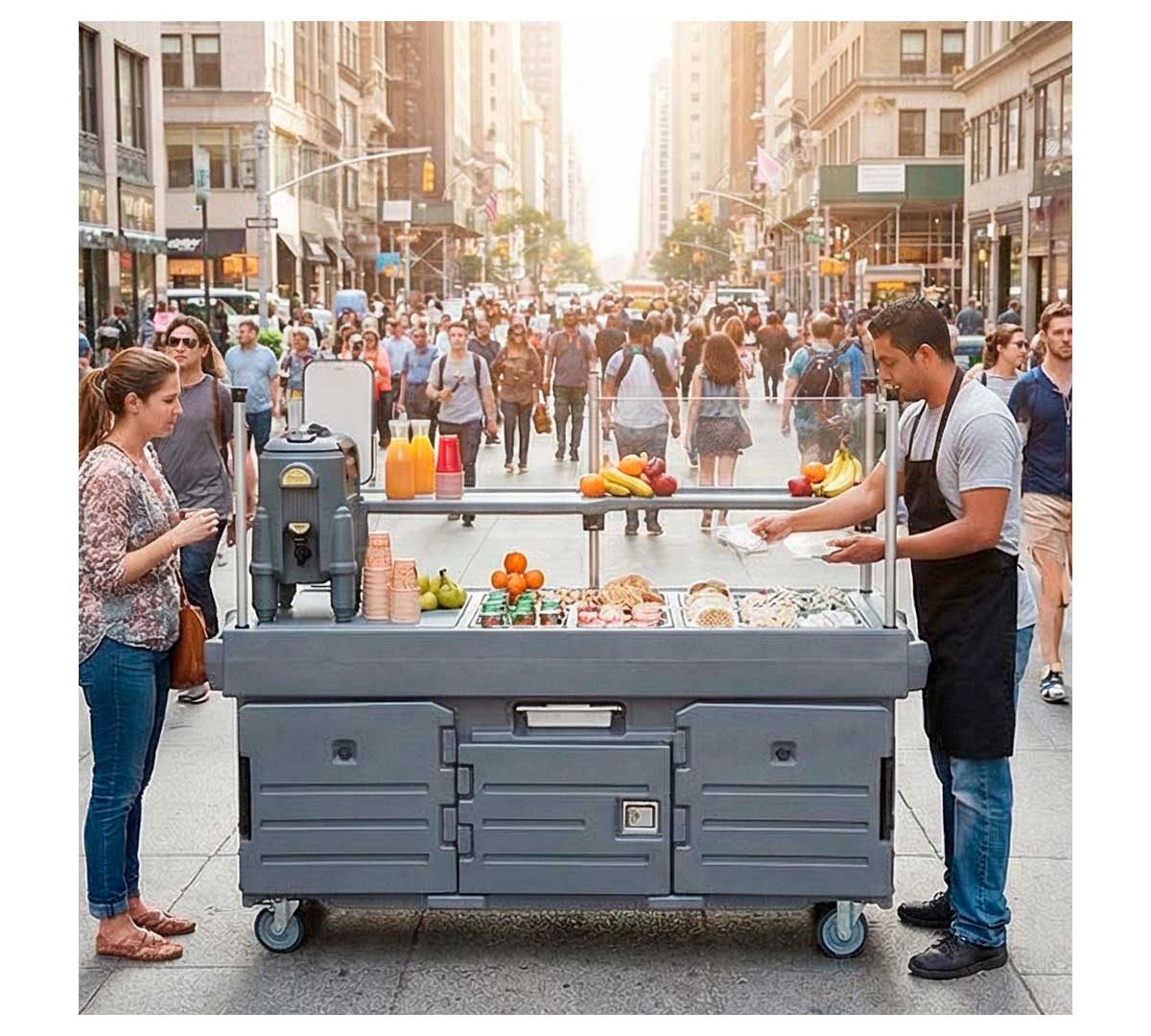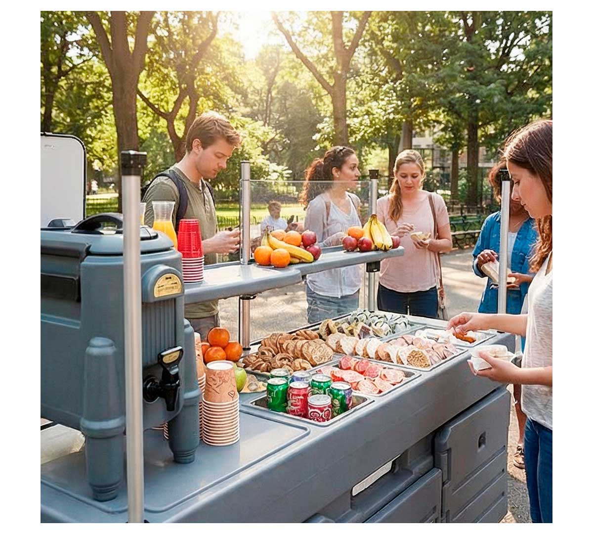 Está diseñado para venta y servicio de alimentos en eventos, ferias, catering, centros comerciales, hospitales y entornos de hostelería móvil donde se requiera autoservicio organizado y venta por impulso.