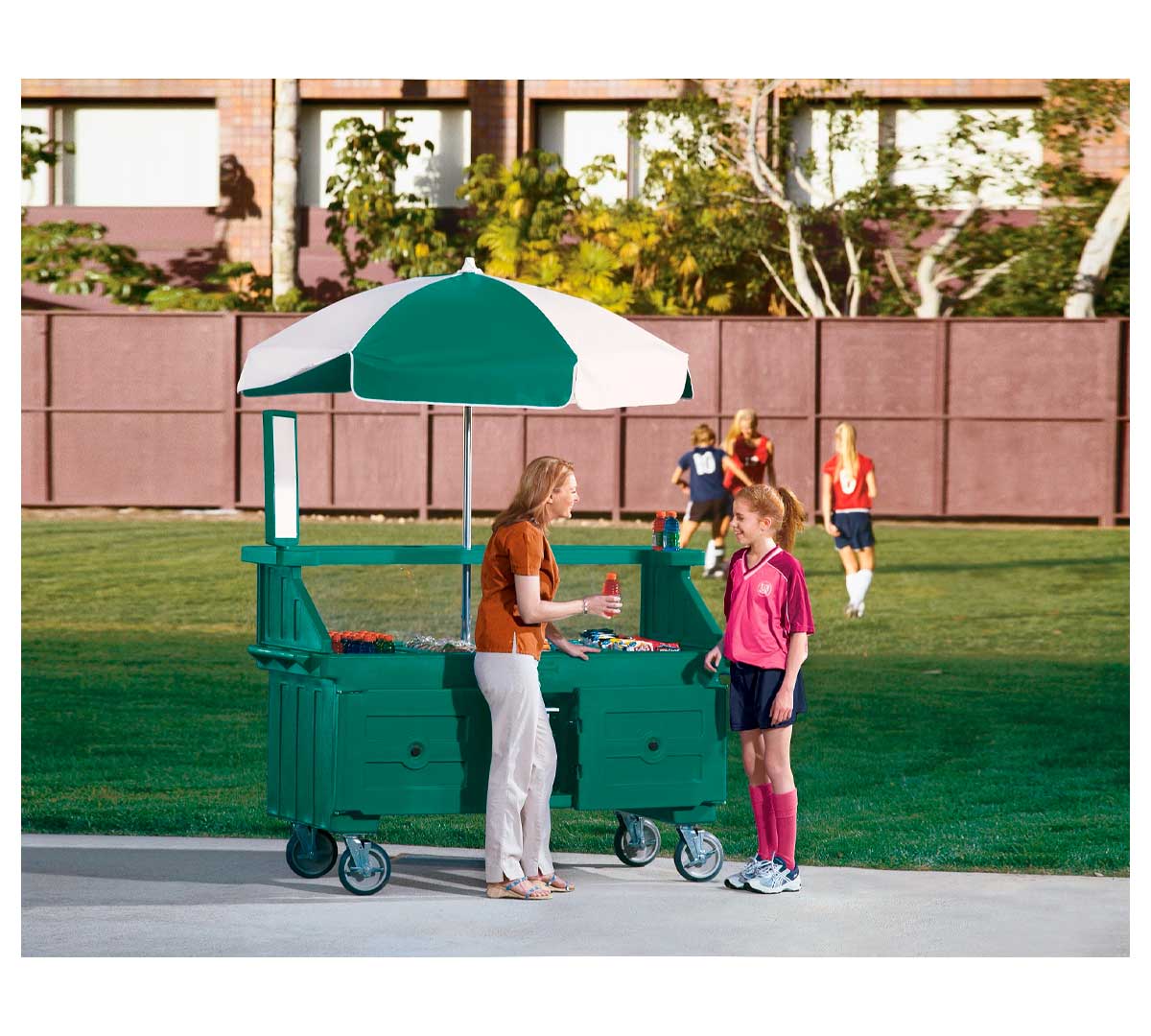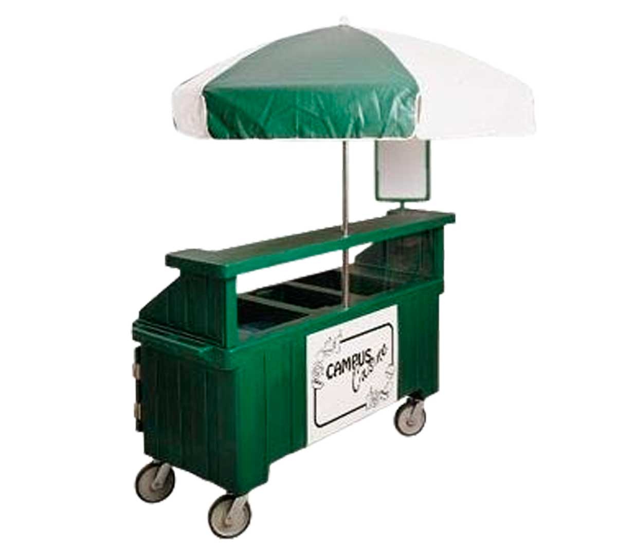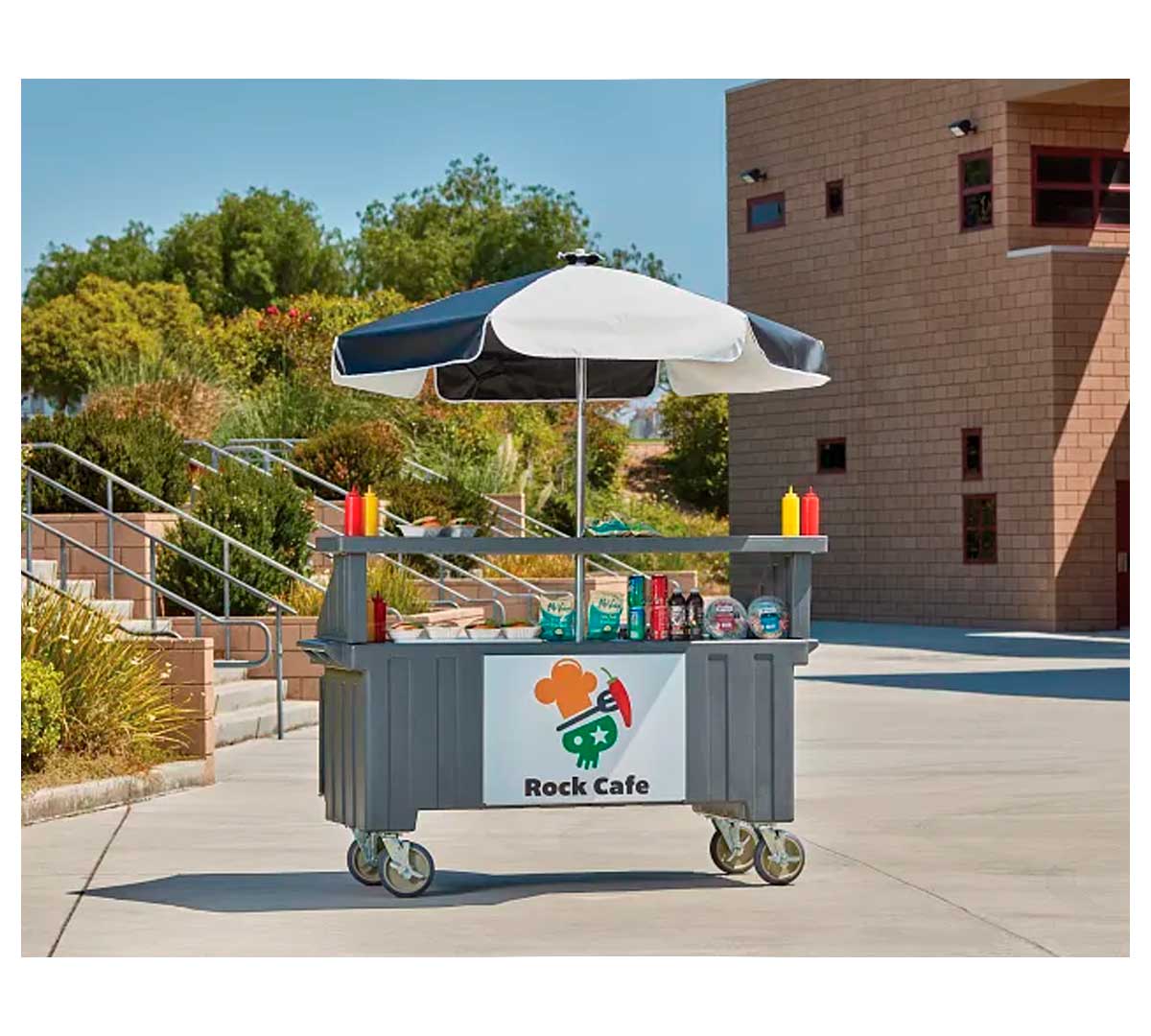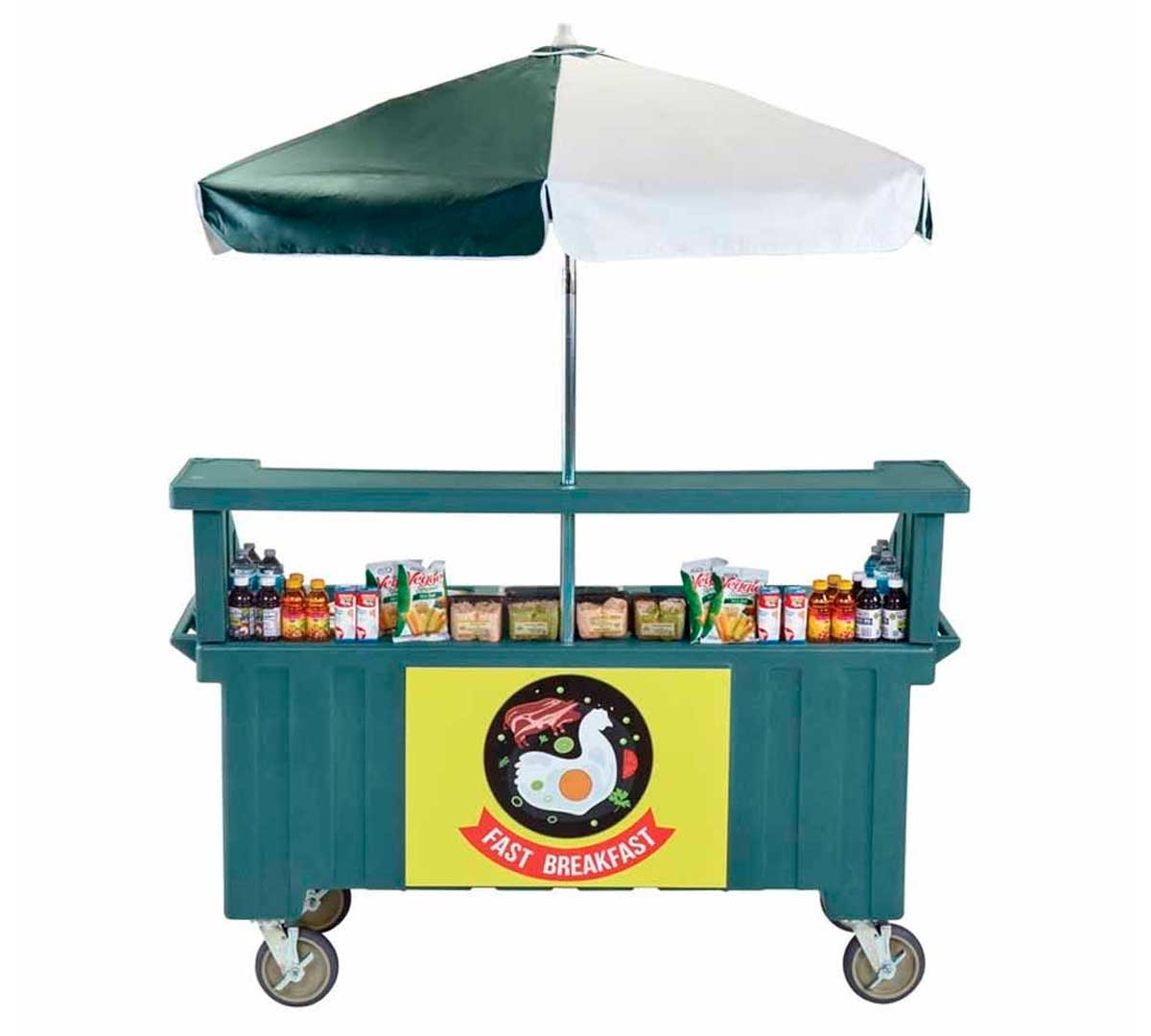 Carro de venta móvil fabricado en polietileno de alta resistencia. Con compartimentos isotérmicos, sombrilla extraíble y panel personalizable. Facilita la exposición y servicio de elaboraciones. Bandejas no incluidas.