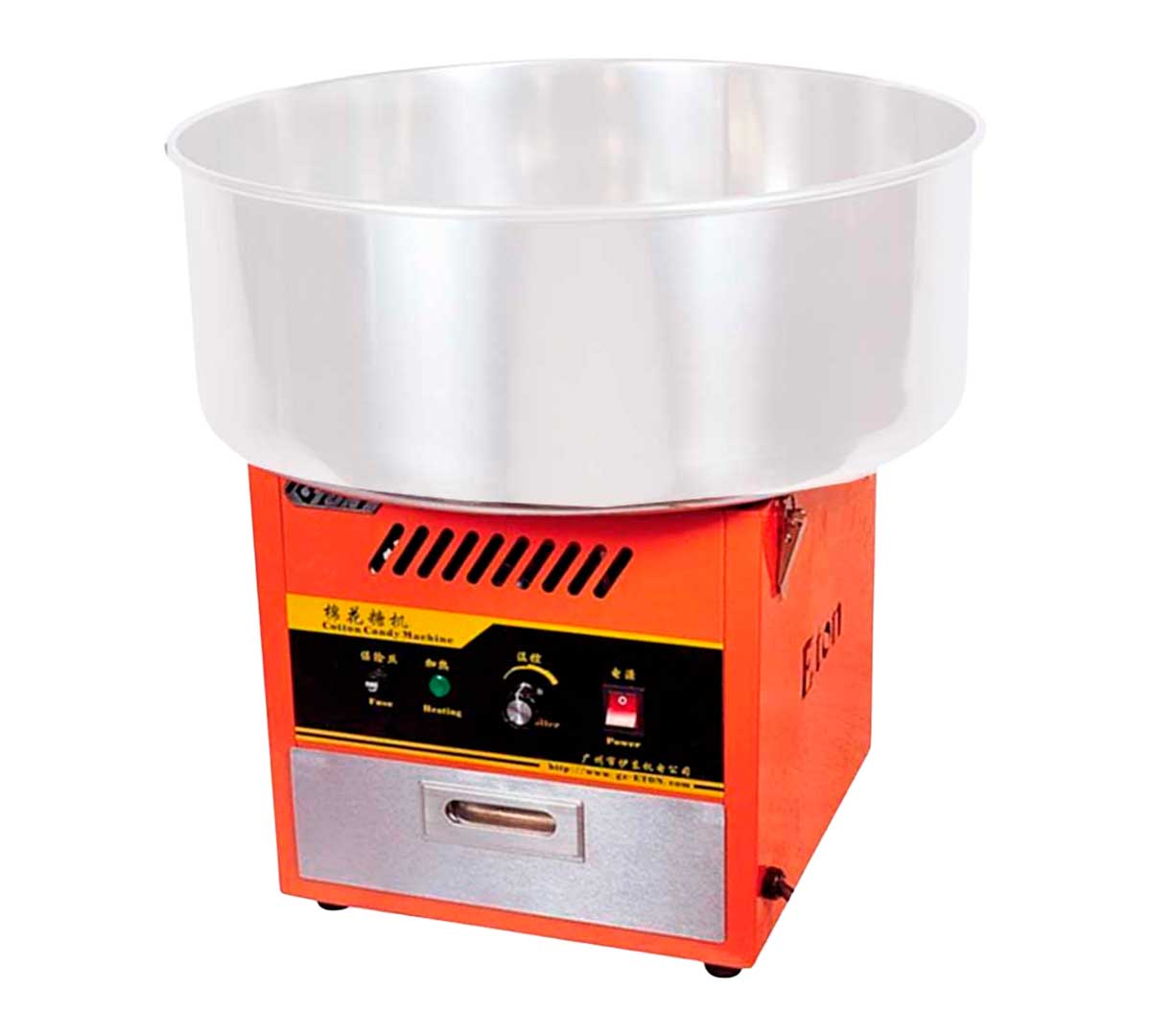 Máquina compacta para elaborar nubes de algodón dulce. Equipada con recipiente independiente. Con cabezal con interruptor. De fácil manejo. Cuerpo robusto y diseño funcional.