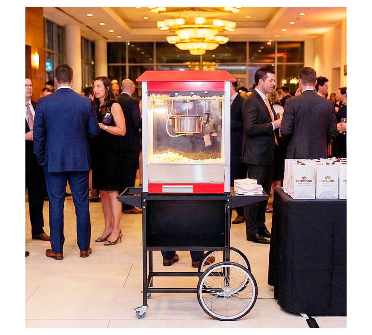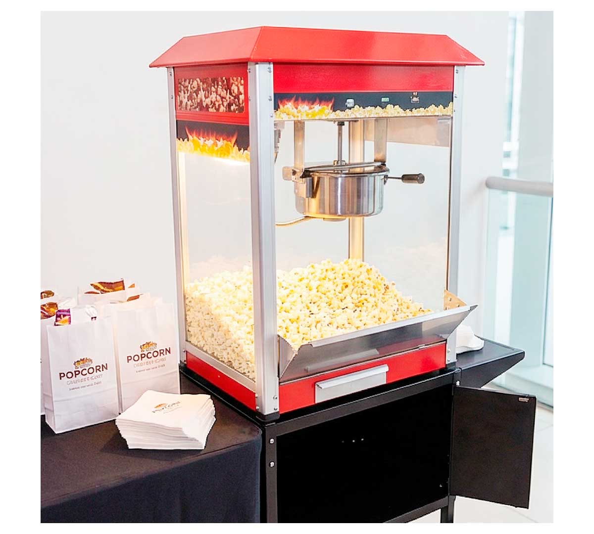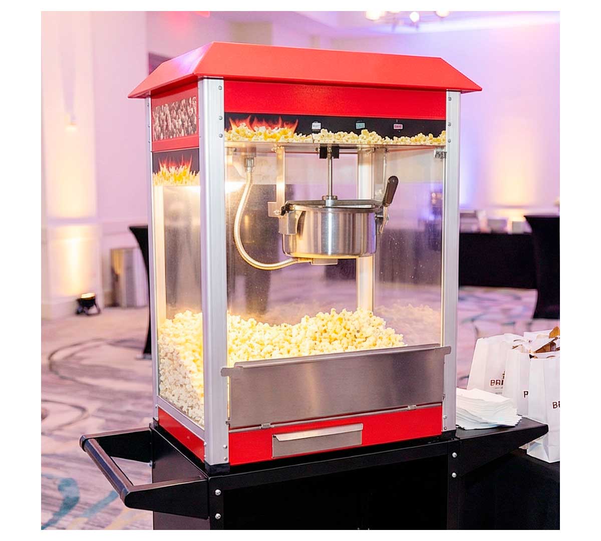 Este equipo para preparar palomitas es ideal para puntos de venta de snacks, cines, ferias, eventos y cualquier espacio donde se requiera una producción continua y eficiente de palomitas recién hechas.