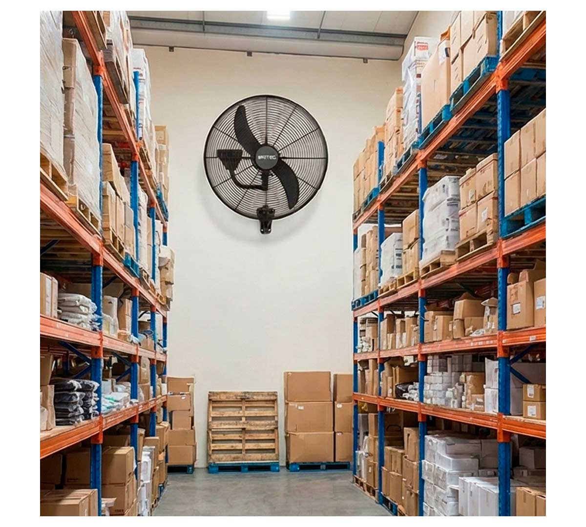 Ventilador mural fijo diseñado para entornos industriales, almacenes, fábricas y centros de trabajo. Dispone de motor de bajo consumo y bajo nivel sonoro. De 3 velocidades y un caudal de aire máximo de 16.200 m³/h. Incluye soporte de pared.