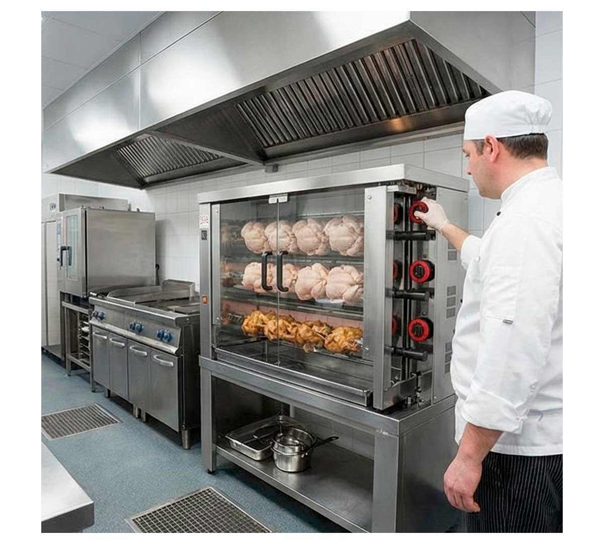 Asador a gas de última generación. Provisto de 3 espadas, 3 pinchos centrales y 2 pinchos laterales. Los mandos se encuentran en la parte frontal del asador para facilitar el acceso. Tiene una potencia de 19.000 Kcal/h.