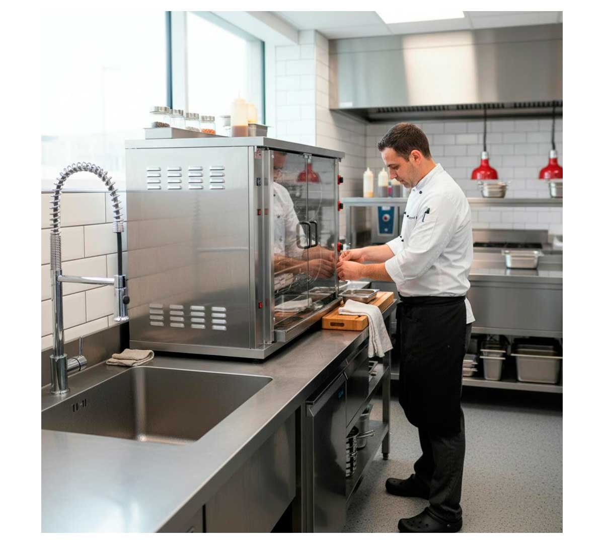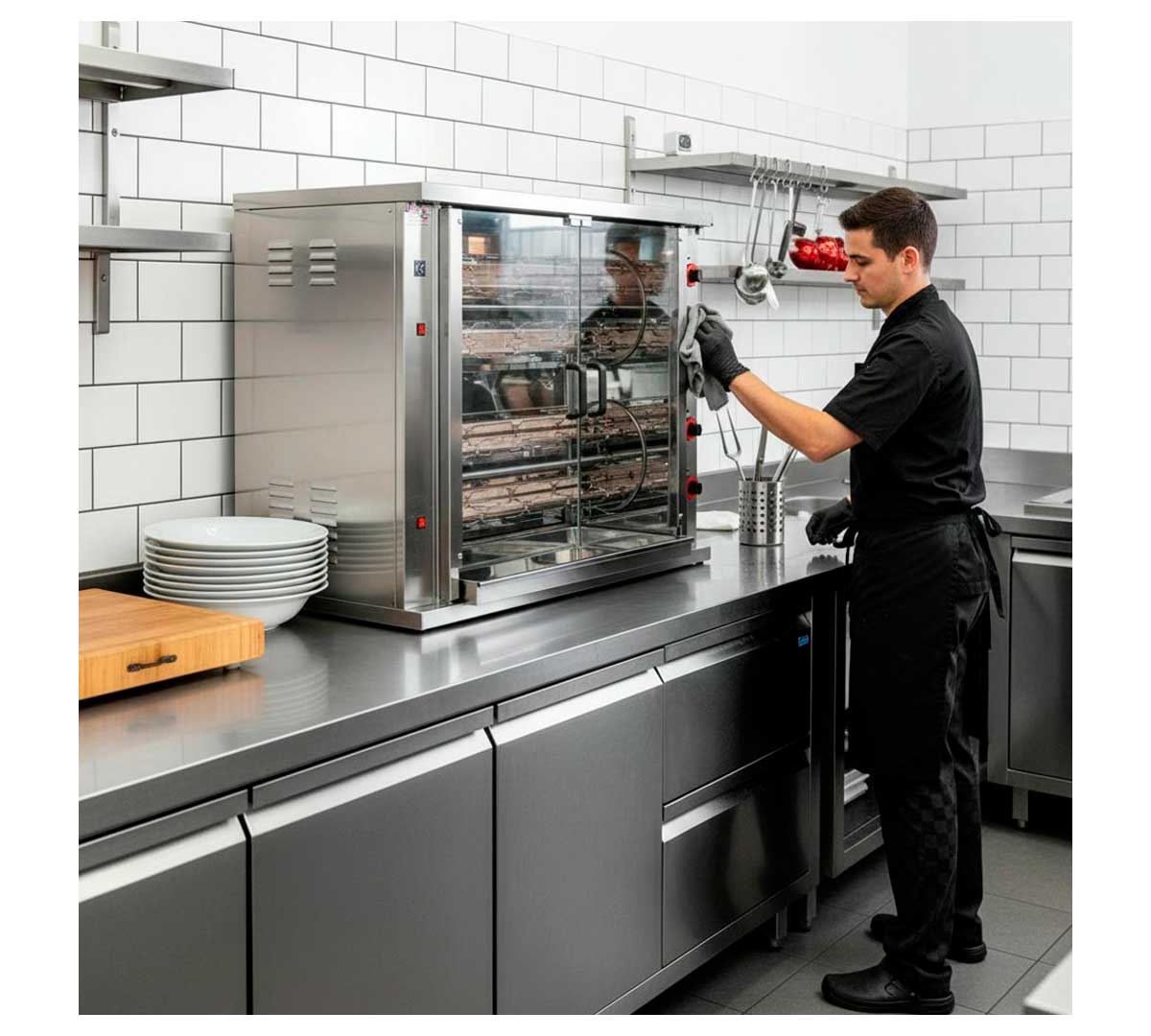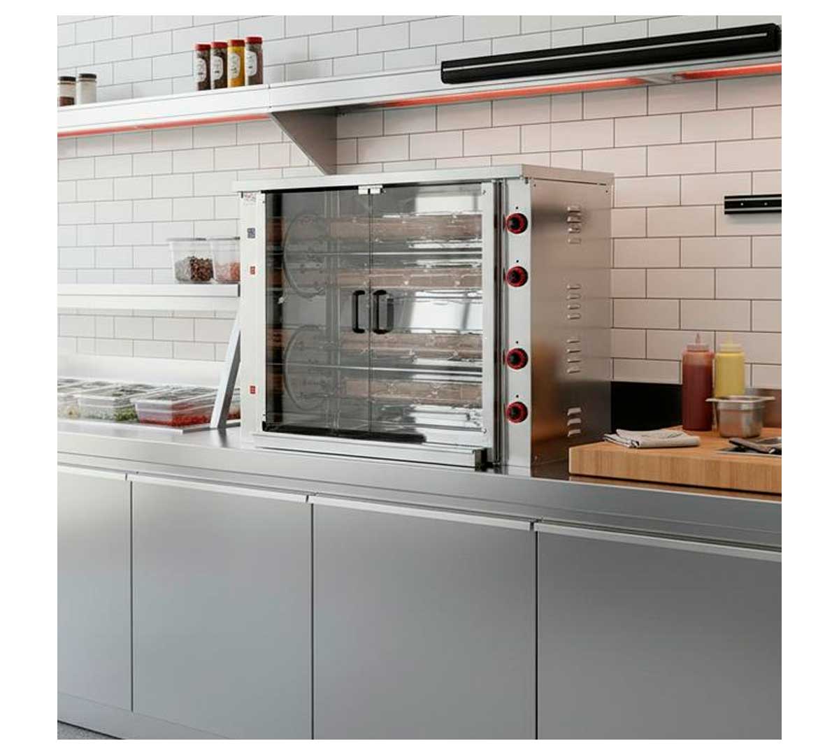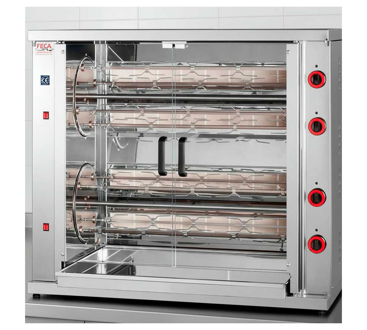 El Asador de Pollos M2 de Feca a gas, es más versátil y tiene una mayor capacidad de trabajo.