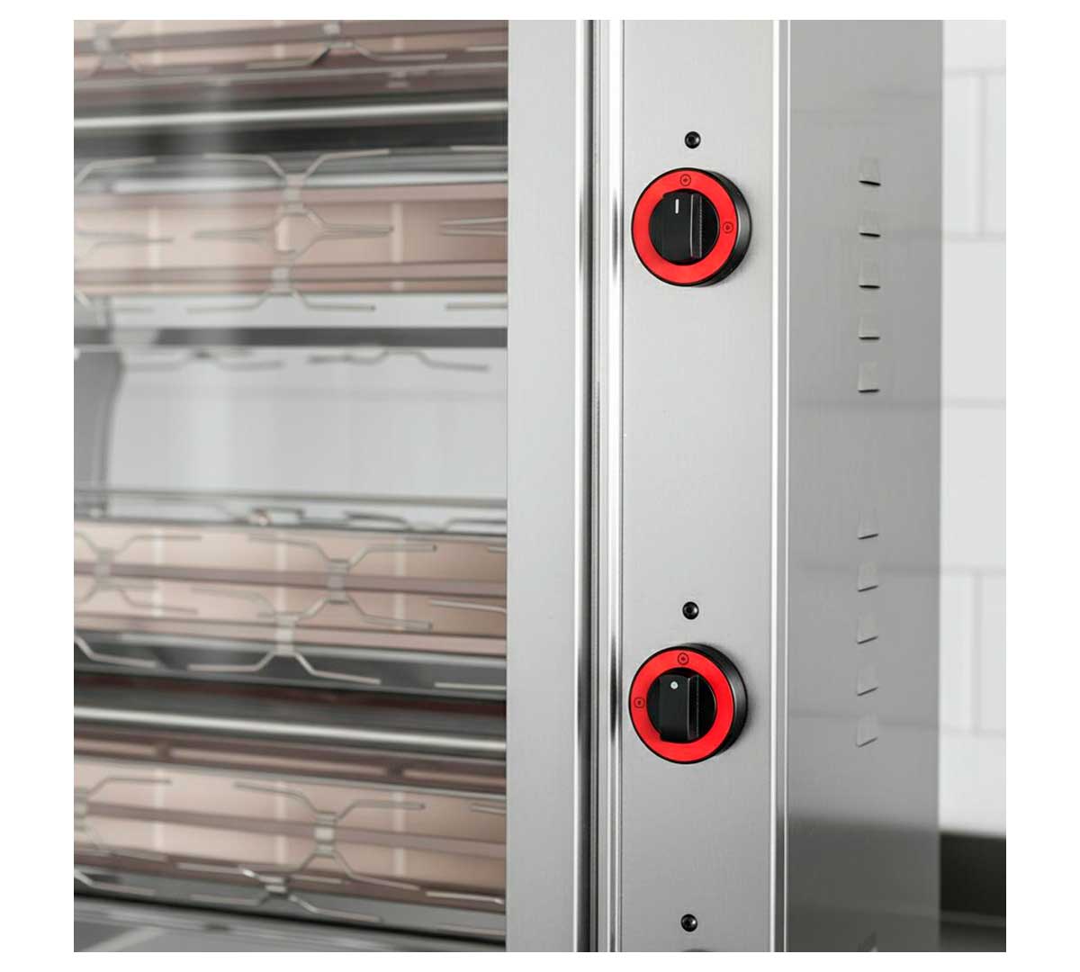 Asador a gas con sistema doble motor que permite detener el tambor y dejar que las espadas sigan girando. Integra función multi-rotativo y 8 espadas. Tiene espacio para 40 - 48 pollos en función de su tamaño y su colocación.
