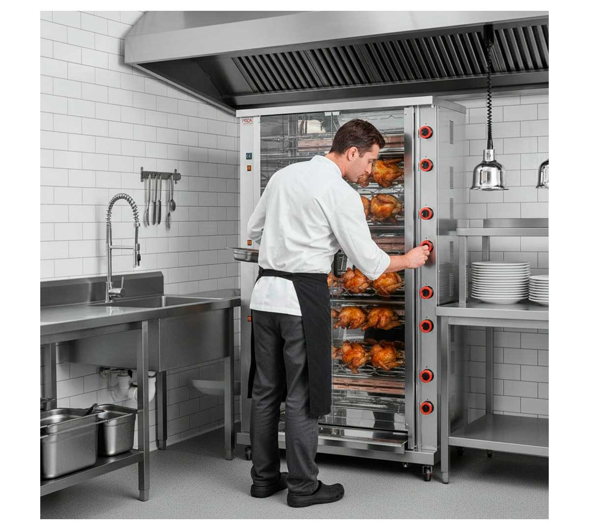Es un asador a gas con motor eléctrico. El motor hace girar los pinchos para que los pollos se cocinen de manera uniforme. La capacidad del asador es orientativa ya que depende del peso y de la colocación de los pollos.
