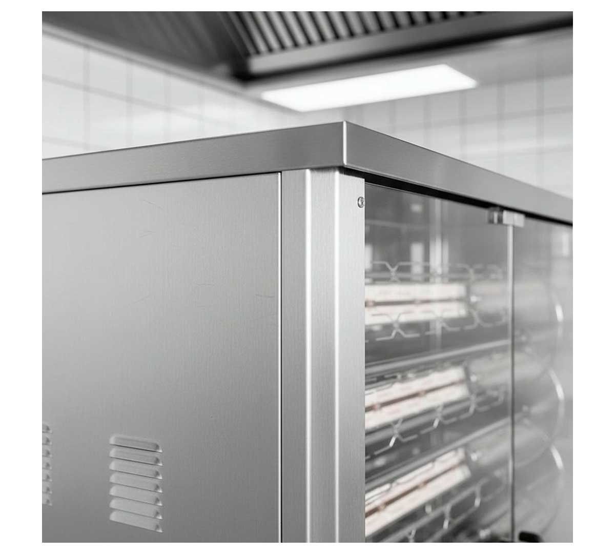 El Asador a gas de la Gama R con mayor capacidad y potencia. Tiene espacio para 80 - 96 pollos en función de su tamaño y su colocación. Integra un sistema doble motor detener el tambor y dejar que las espadas sigan girando. Integra función multi-rotativo y 16 espadas.