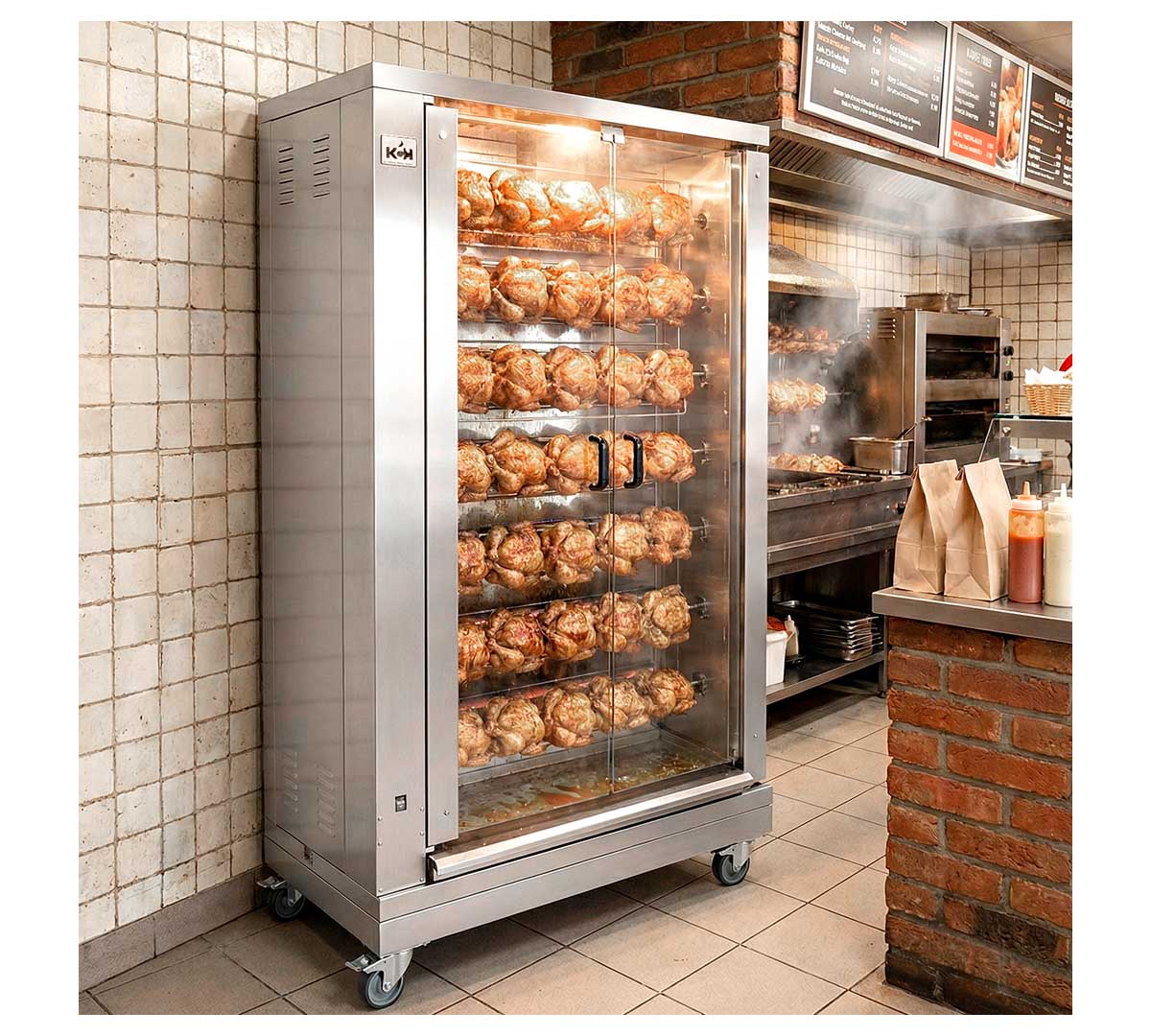 Este modelo de asador pertenece a la serie Vertical y está diseñado especialmente para pollos abiertos. Tiene una capacidad de 42 pollos.
