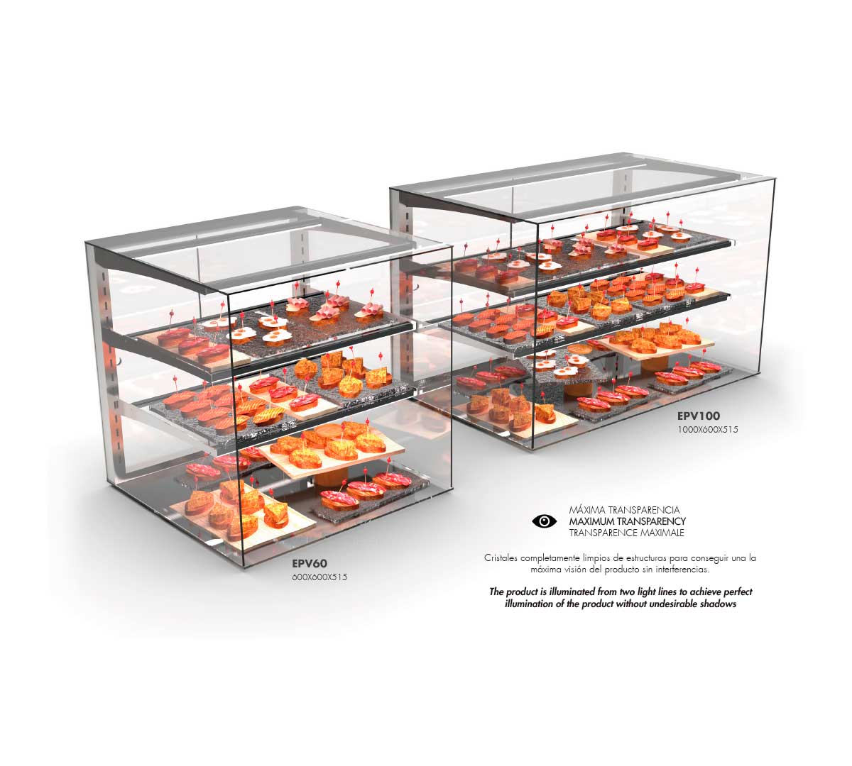 Este expositor neutro es ideal para la presentación de bollería, bocadillos, snacks, pastelería y productos fríos en buffets, cafeterías, panaderías y zonas de autoservicio, donde la visibilidad y la iluminación del producto son esenciales para potenciar la venta.