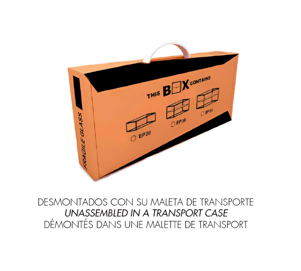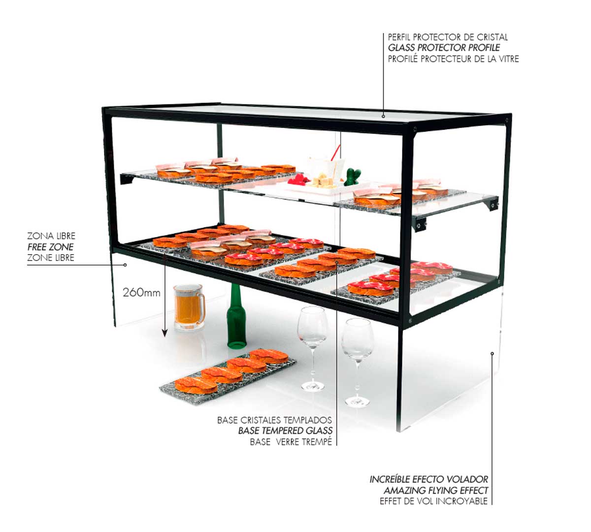 Vitrina expositora neutra con estante y pasaplatos. Fabricada con cristal templado y perfil protector de cristal. Destaca por la zona libre para servir tapas sin renunciar a la exposición de los productos. Se sirve desmontada.