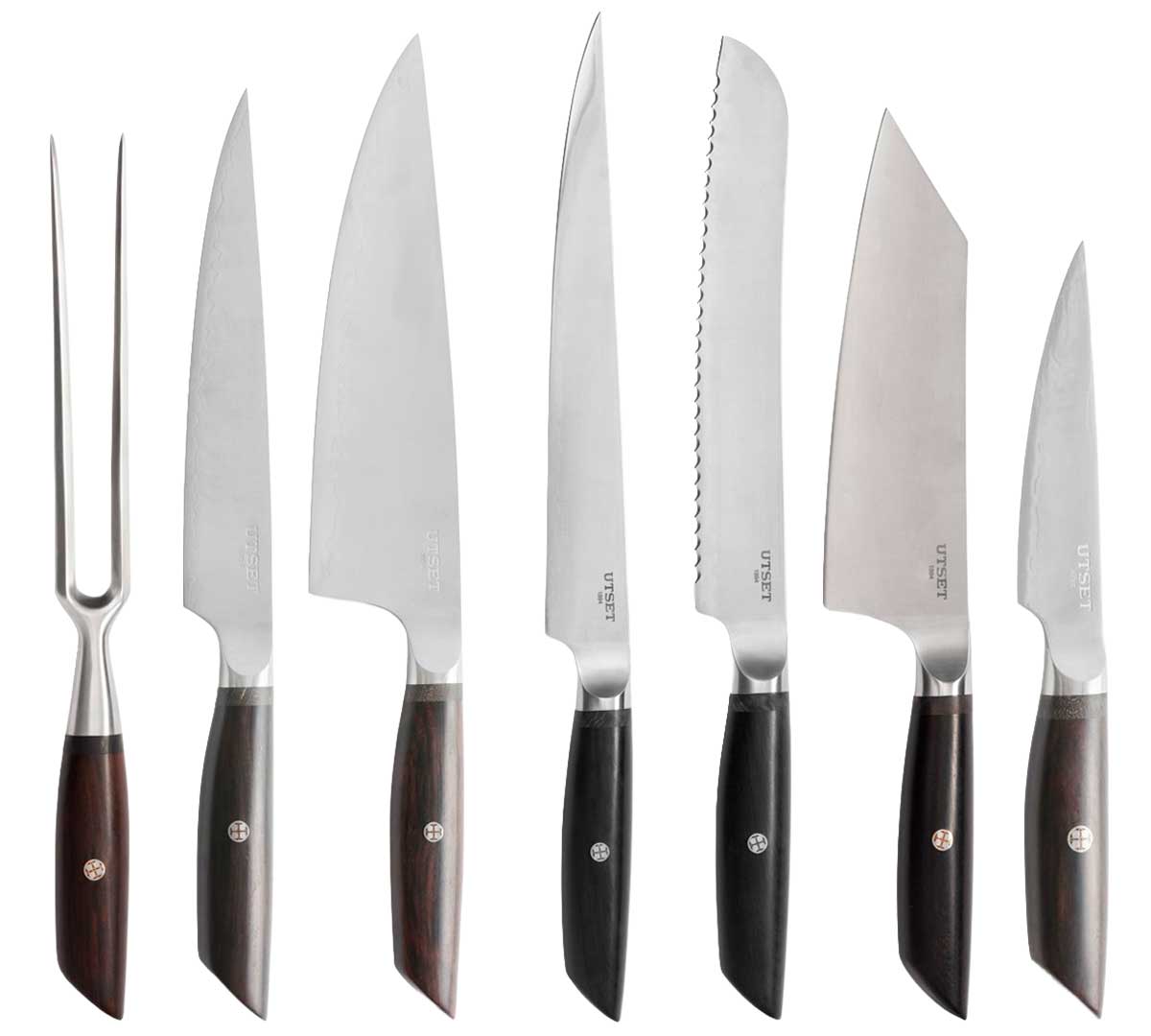 Cuchillos de alta precisión fabricados en acero japonés AUS10. Con mango de madera de ébano. Diseñados para corte profesional y durabilidad óptima en cocina.
