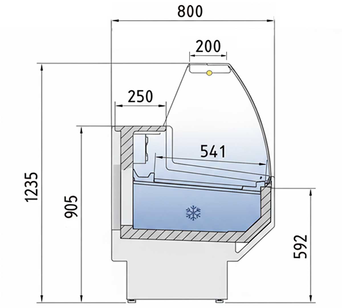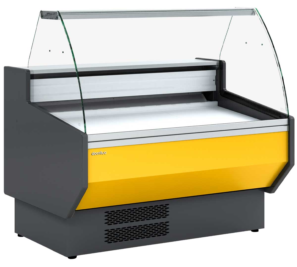 Vitrina expositora con cristal curvo, sin estante y con frontal abatible. Está diseñada para carnicerías, charcuterías o exposición de lácteos. La estructura es de acero plastificado. Con encimera de acero inoxidable, perfilería de aluminio lacado, iluminación LED y control electrónico. El frontal superior está disponible en 8 colores. Los laterales y la parte frontal inferior son de color antracita.