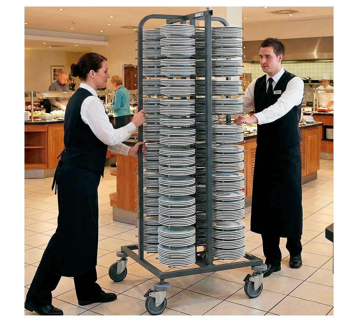 Carro porta plato diseñado para poder cambiar su estructura y ajustarla a la medida del plato. Este producto permite almacenar y servir una gran cantidad de platos en un espacio muy reducido.