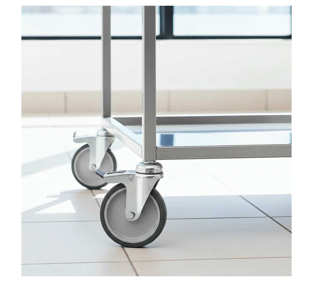• 4 ruedas pivotantes de goma gris, dos de ellas con freno, Ø 125 mm.