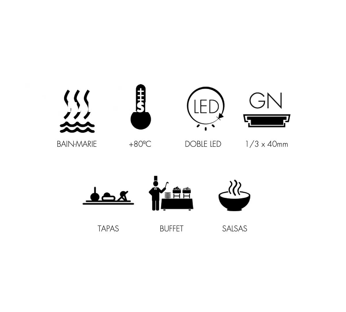 Este tipo de vitrina es ideal para mantener calientes tapas, guarniciones, salsas, productos de buffet y otros platos preparados que requieren una temperatura constante y segura durante el servicio. Su diseño facilita la exposición y el autoservicio en entornos de restauración, cafeterías y bufés.