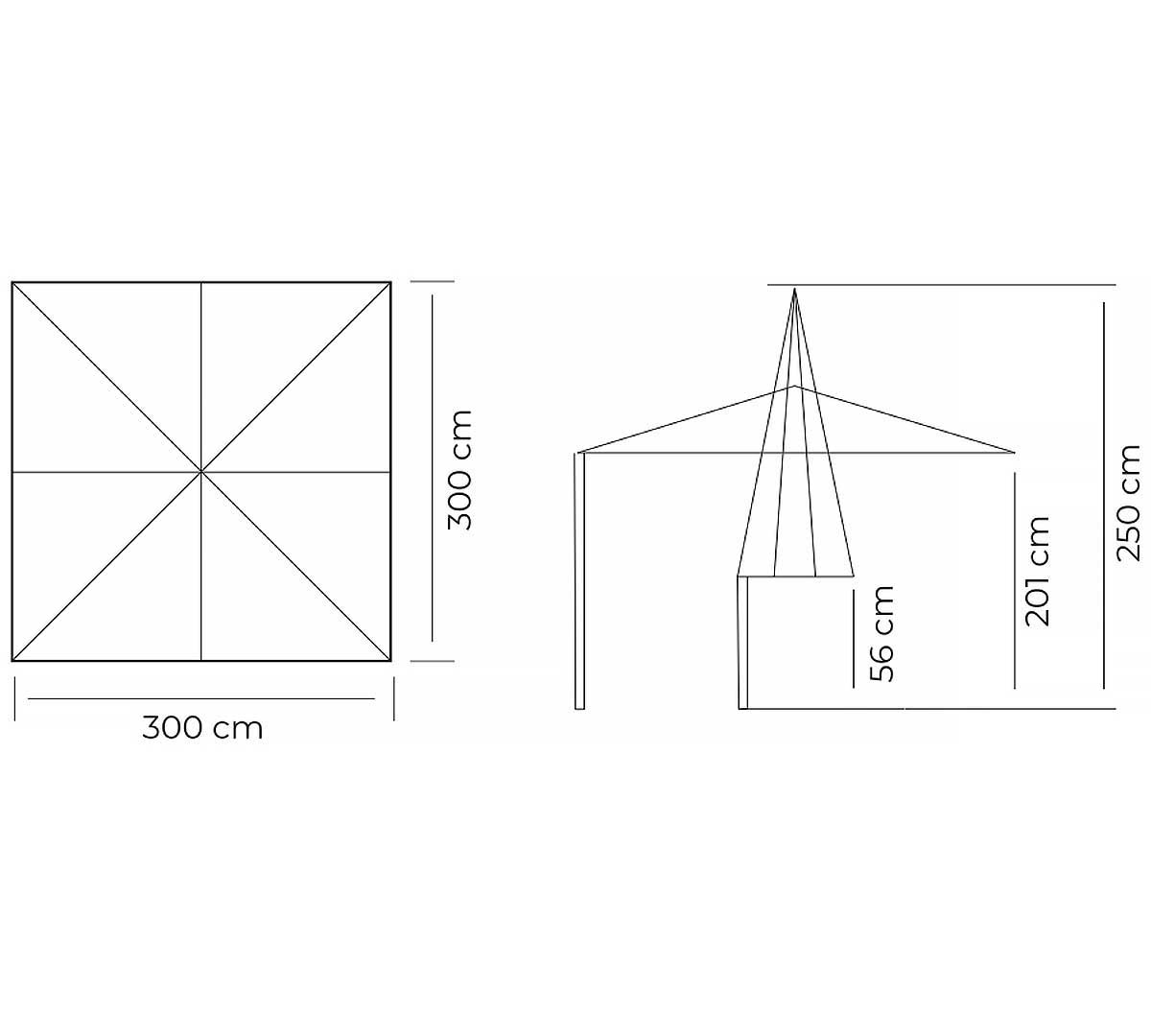 Sombrilla cuadrada con mástil lateral de aluminio y en color blanco. El mástil tiene un diámetro de 65 mm. El telaje es de poliéster en color crudo. La apertura es mediante manivela. La base en cruz está incluida. Las losas se venden por separado. Consulta las bases disponibles.