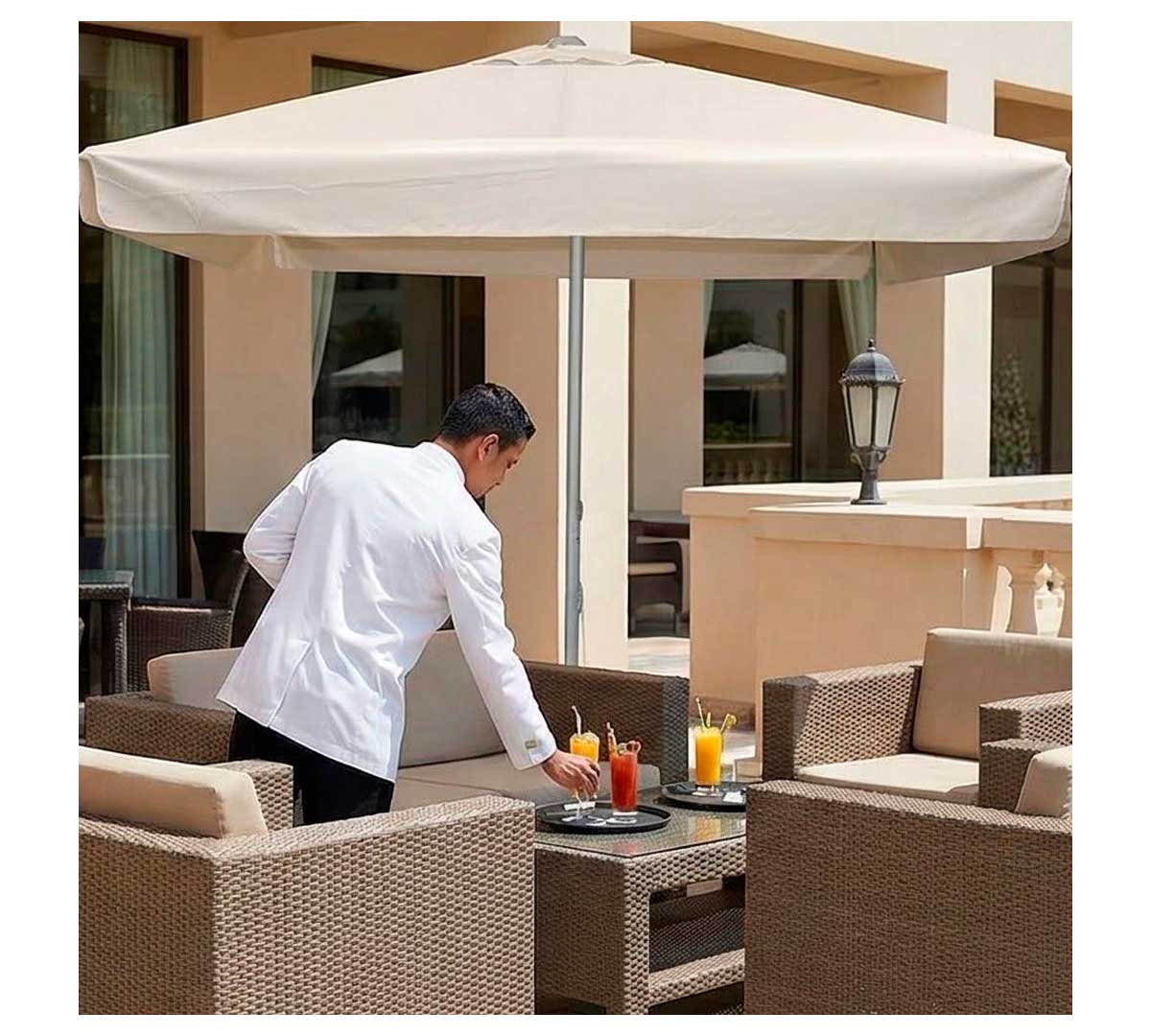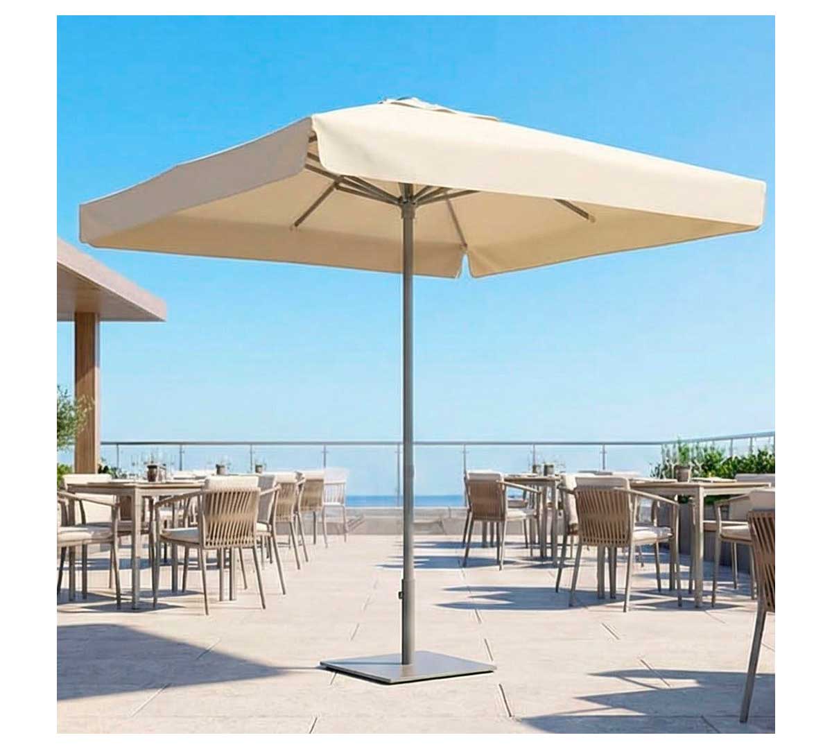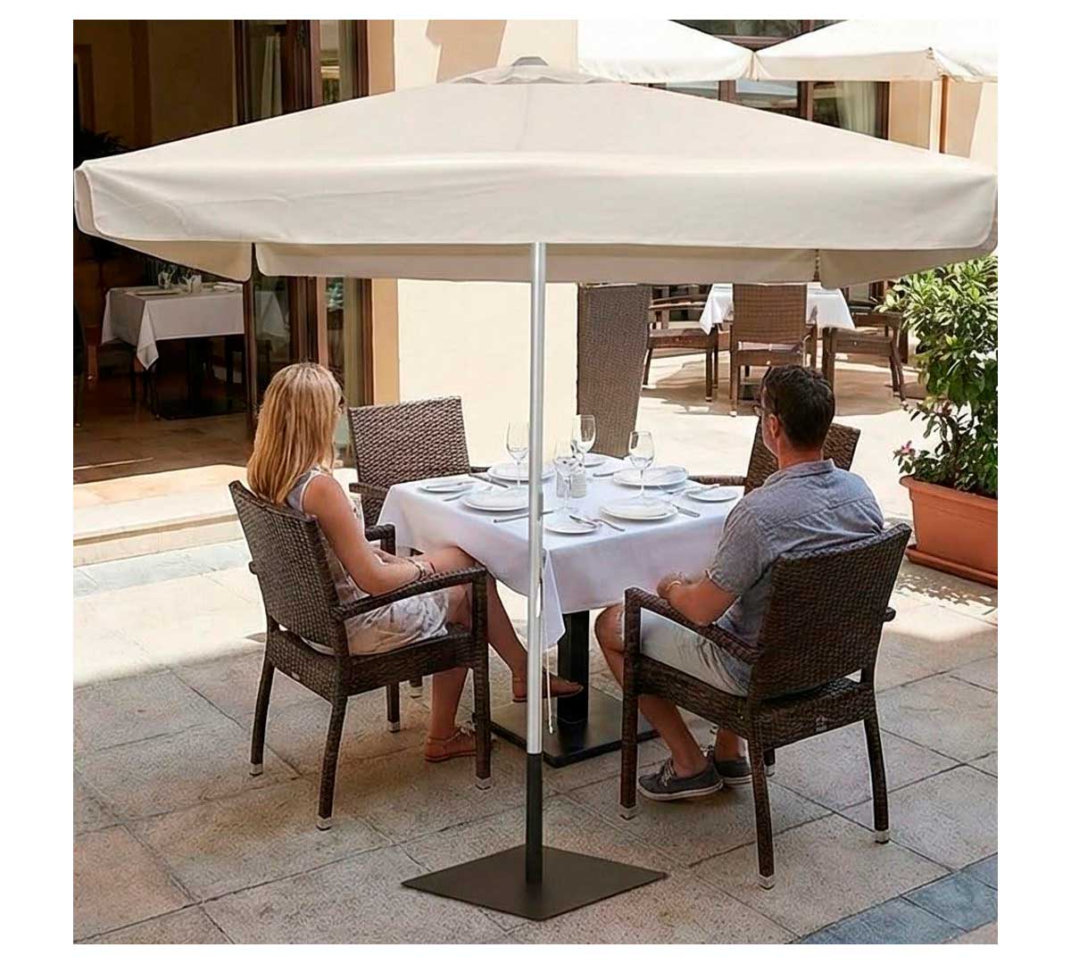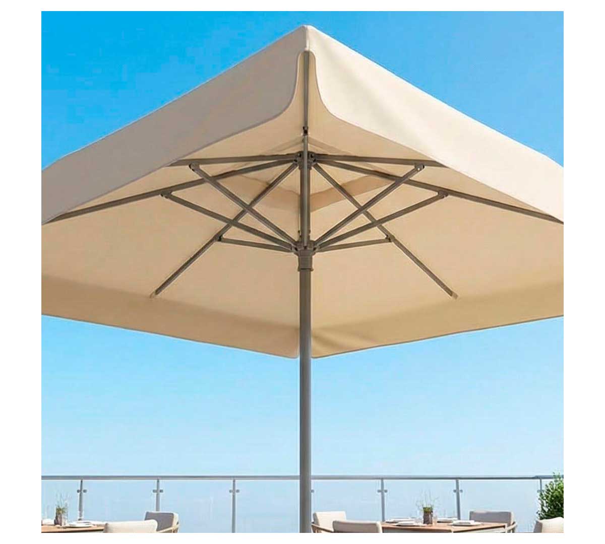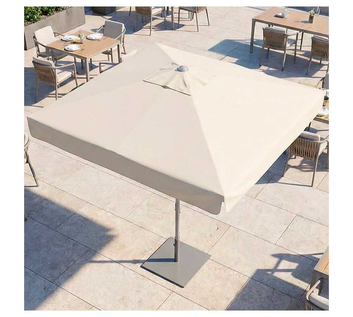 Sombrilla cuadrada con el mástil de aluminio lacado en color gris y de dos piezas. El telaje de poliéster en color crudo repelente al agua con faldón. La base no está incluida. Consulta las bases disponibles.