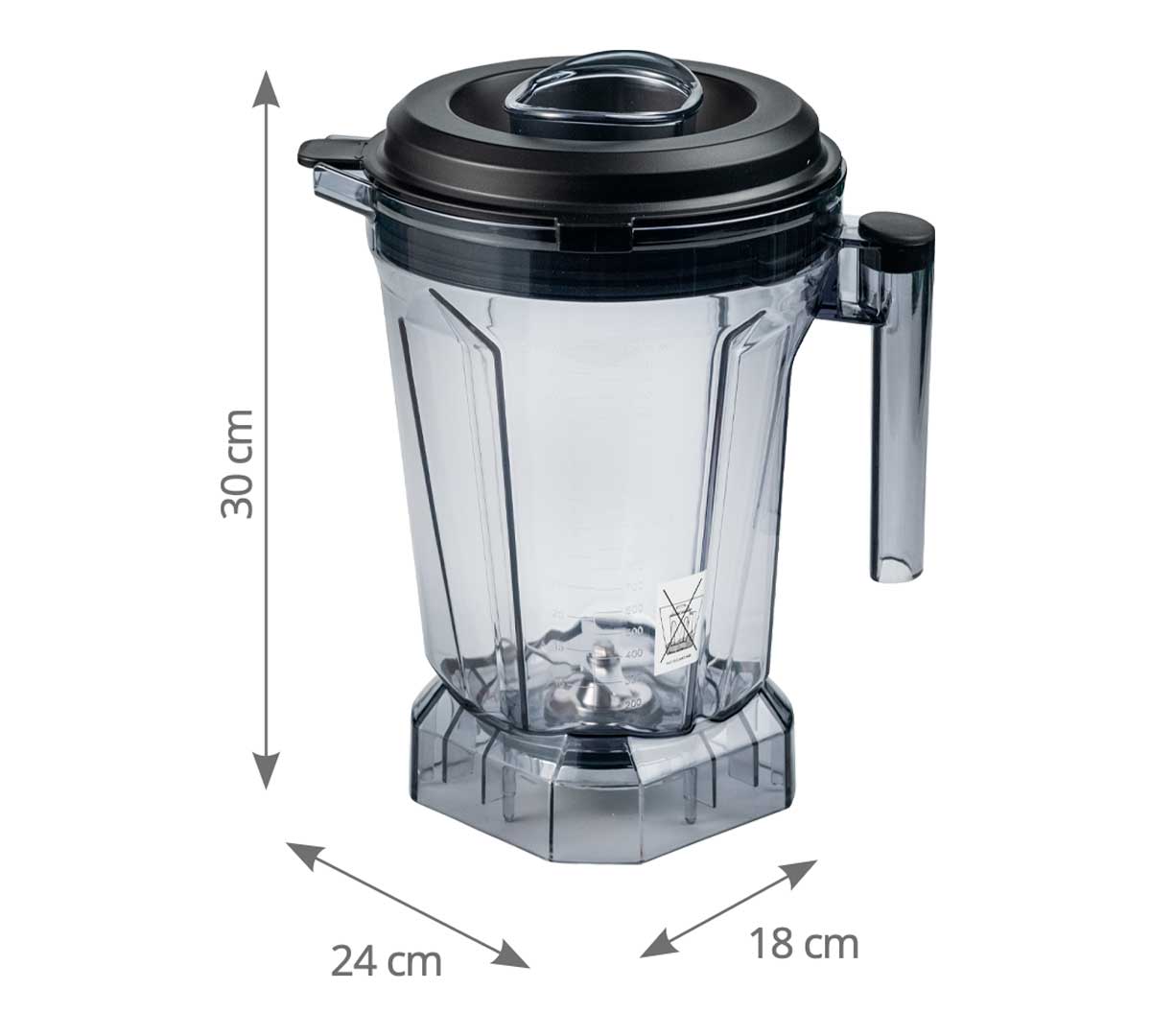 Jarra profesional de 2,5 litros en Tritan con sistema de 6 cuchillas, diseñada para trabajar grandes volúmenes en batidoras de alto rendimiento en hostelería profesional.