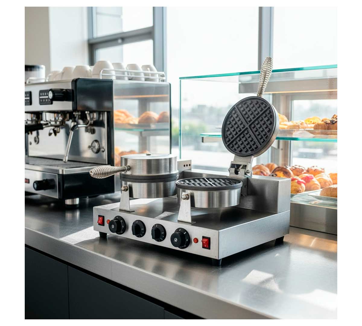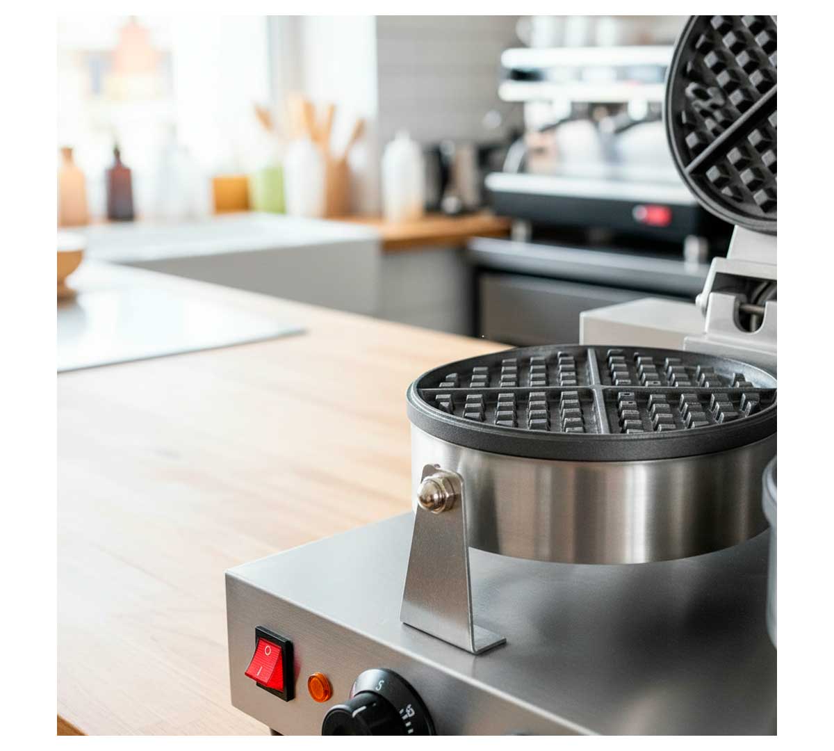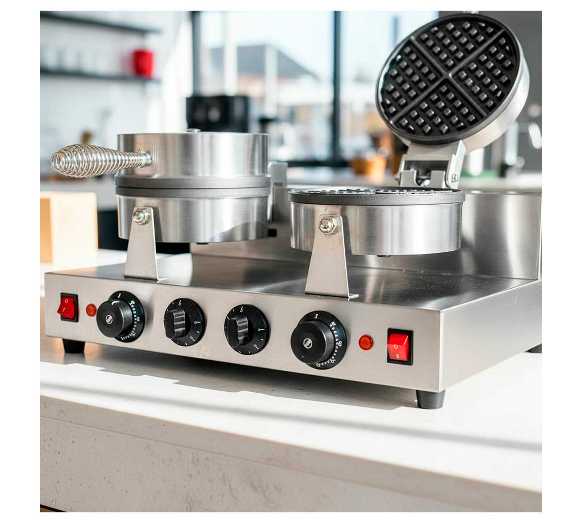 Gofrera de uso profesional. Tiene dos placas redondas que se controlan independientemente. Permite seleccionar la temperatura de 50 a 300 ºC. Equipada con temporizador con señal acústica.