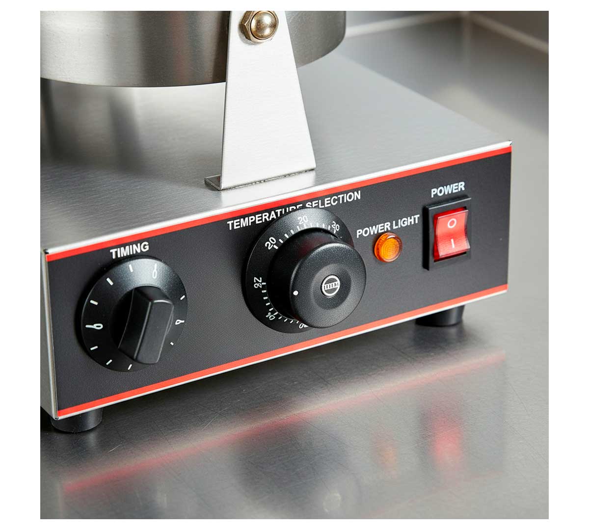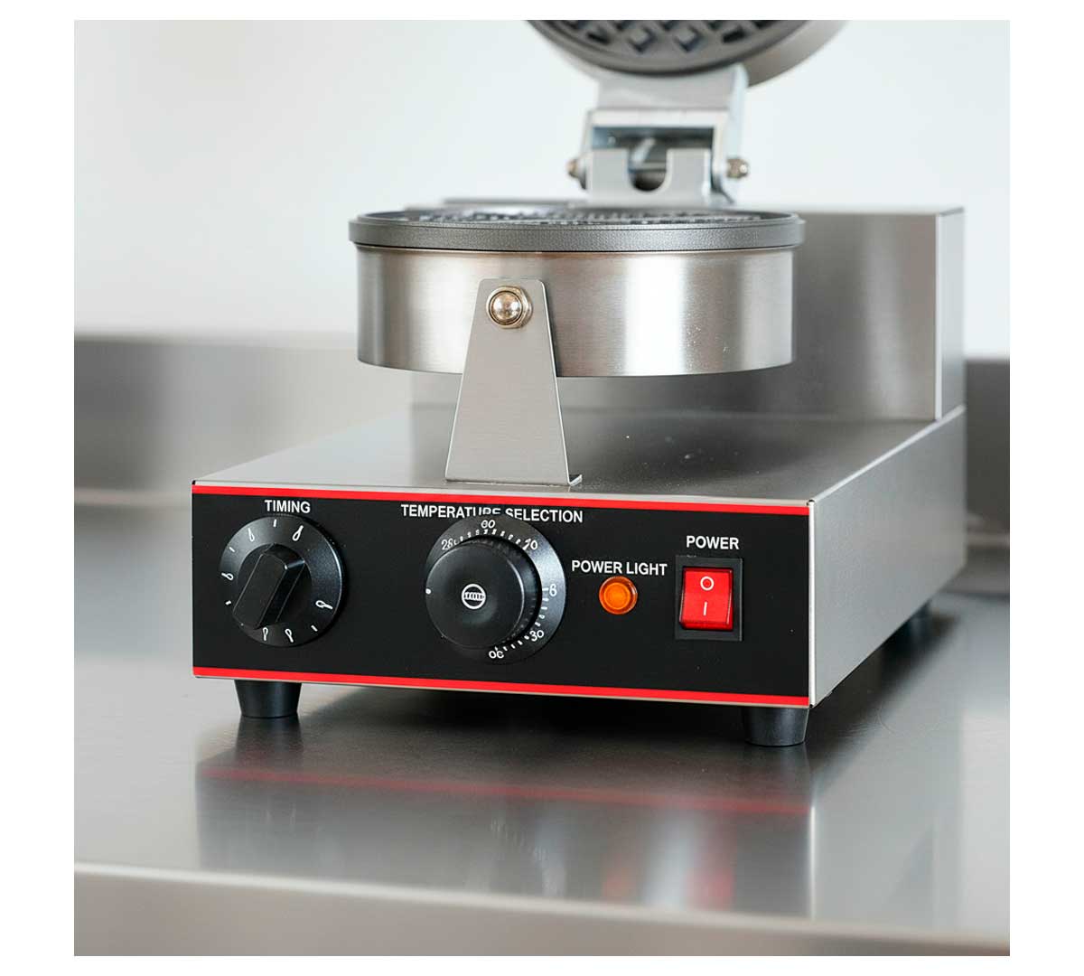 Gofrera de uso profesional con una placa redonda con 4 divisiones. De diseño robusto y fácil de manejar. Permite seleccionar la temperatura de 50 a 300 ºC. Tiene temporizador con señal acústica.