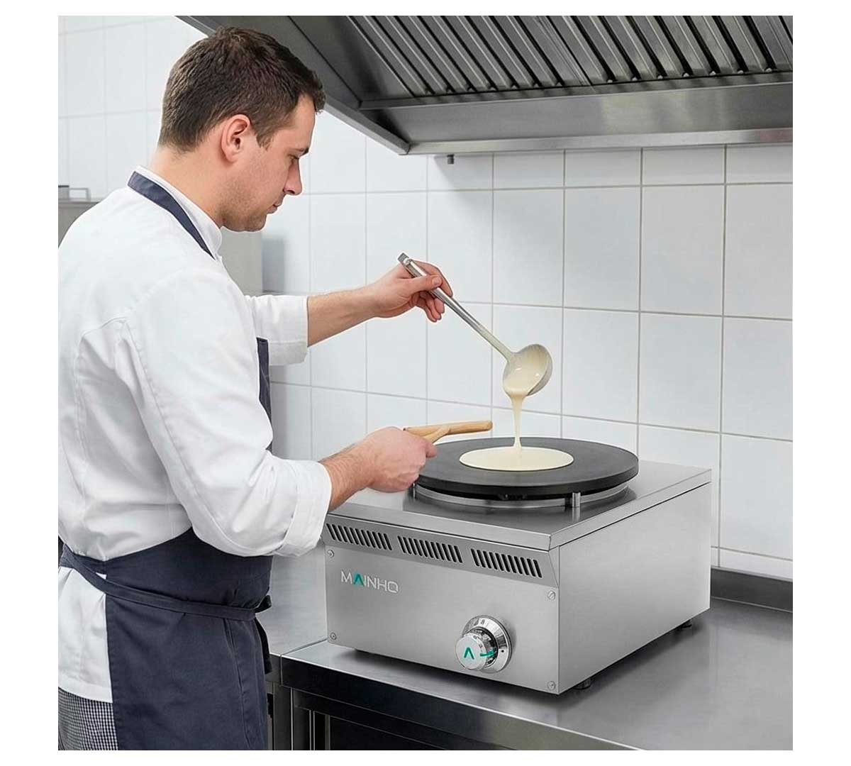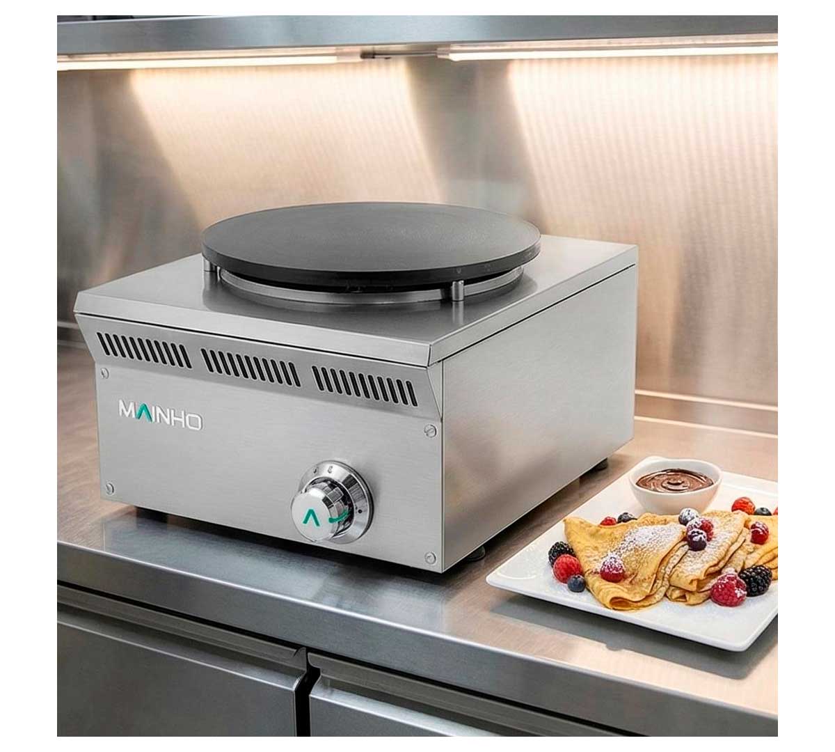 Este equipo está especialmente indicado para la preparación de crepes dulces y salados en cafeterías, creperías, buffets, eventos y servicios de catering. Su diseño compacto permite integrarlo fácilmente en cocinas con espacio limitado, mientras que su robustez y control térmico lo hacen perfecto para un uso intensivo y continuo.
