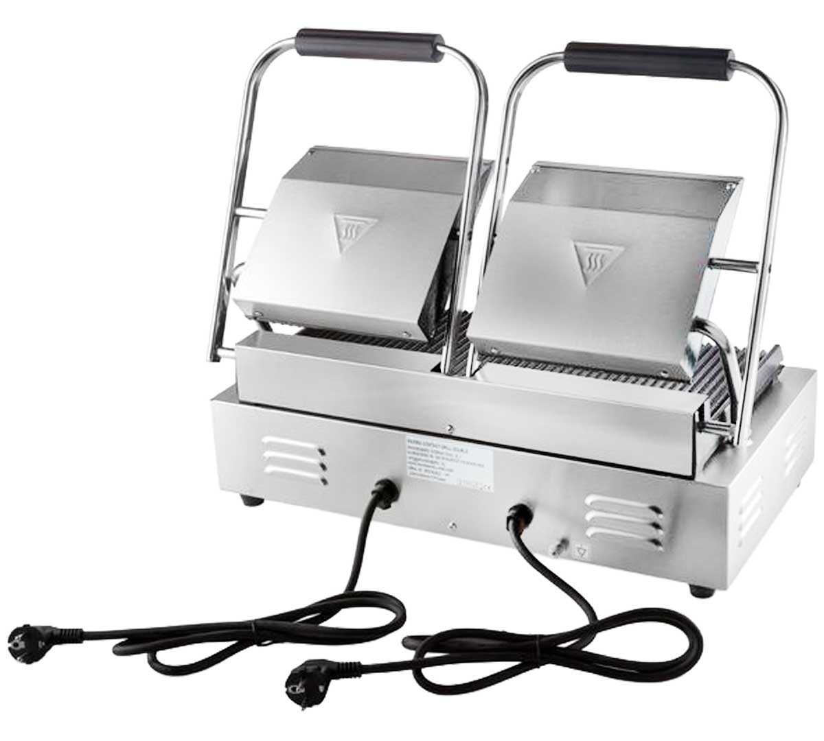 Grill de contacto doble con placas acanaladas de hierro fundido, carcasa de acero inoxidable, control independiente de temperatura hasta 300 °C y bandeja recogegrasas extraíble. Diseñado para uso intensivo en restaurantes y cocinas profesionales de alta rotación.