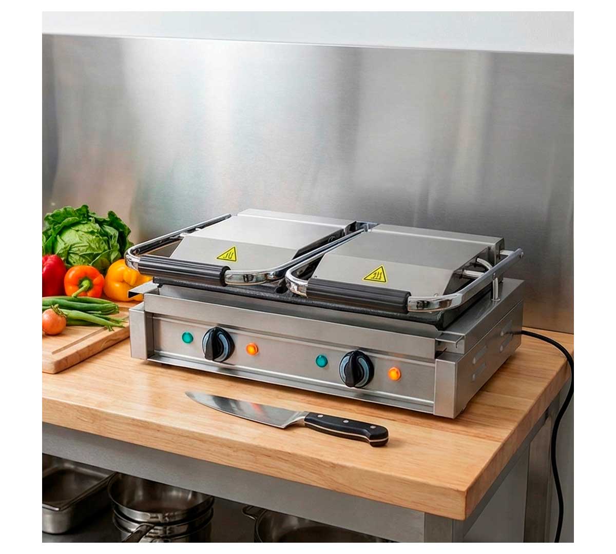 La plancha Panini Doble se caracteriza por la base acanalada y doble tapa superior acanalada. Tiene una potencia de 3.600 W.